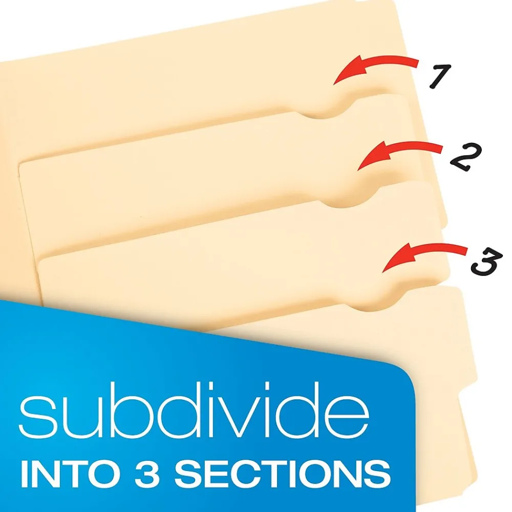 Includes four tabs for easy labeling of both the folder and three subdivisions inside it. The manila paper is durable and easy to write on, making these folders versatile, while the standard letter sizing works with most documents. Resistant to staining and abrasion, these folders are designed to handle the rigors of regular office use.