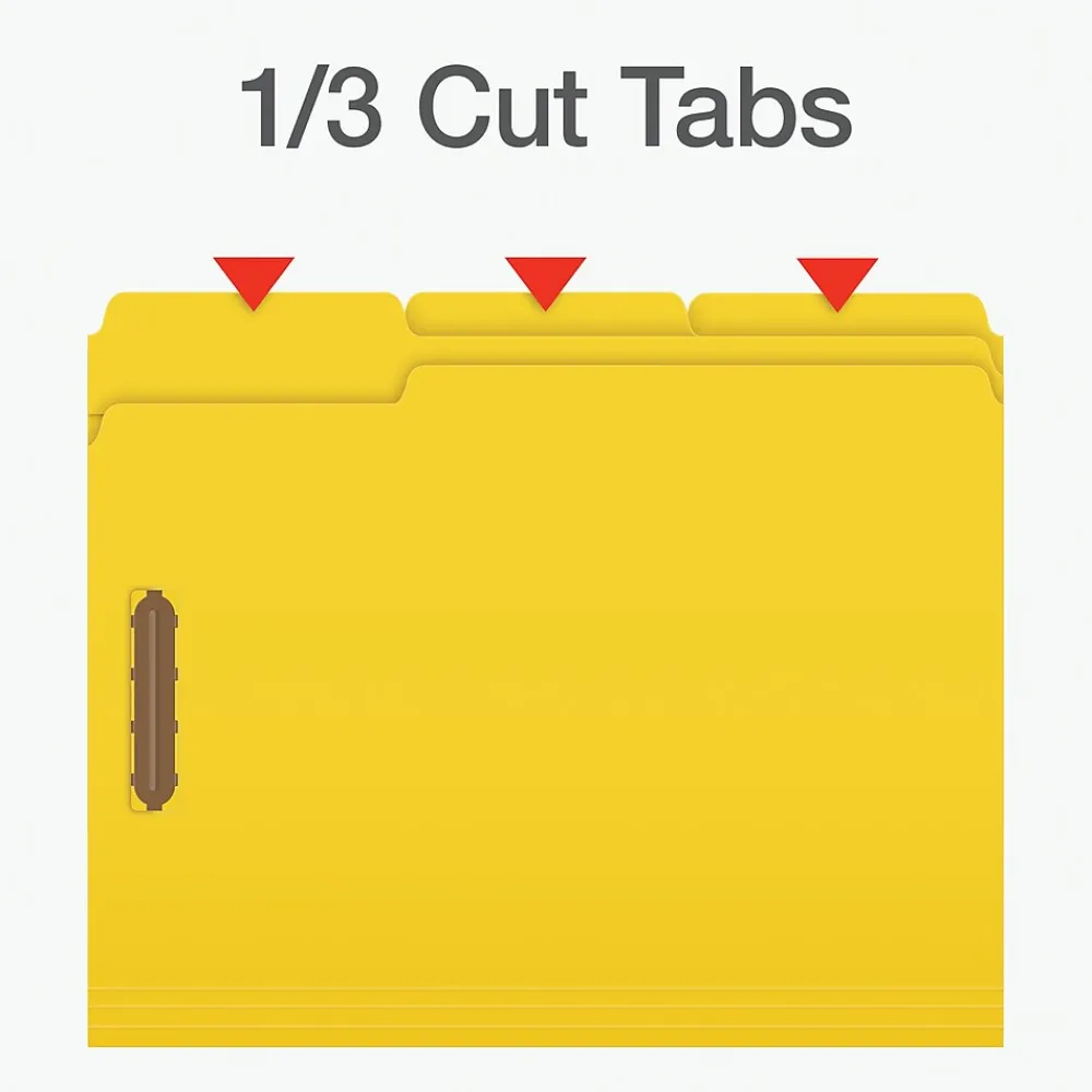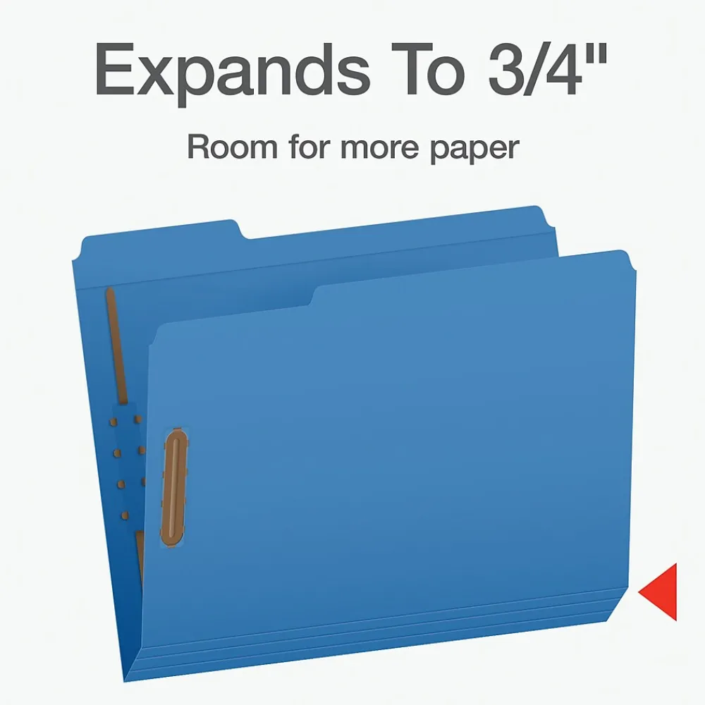 These Pendaflex Fastener Folders have thick, reinforced tabs that will better withstand wear and tear. Two embedded fasteners keep paperwork ordered and in place. The 1/3 cut tabs come in 3 different positions (left, right, center), so you can see all of your labeled tabs easily. Each folder fits letter-sized papers and is scored along the bottom for 3/4 inch expansion. Box of 50 fastener folders in assorted colors (blue, red, green, yellow).