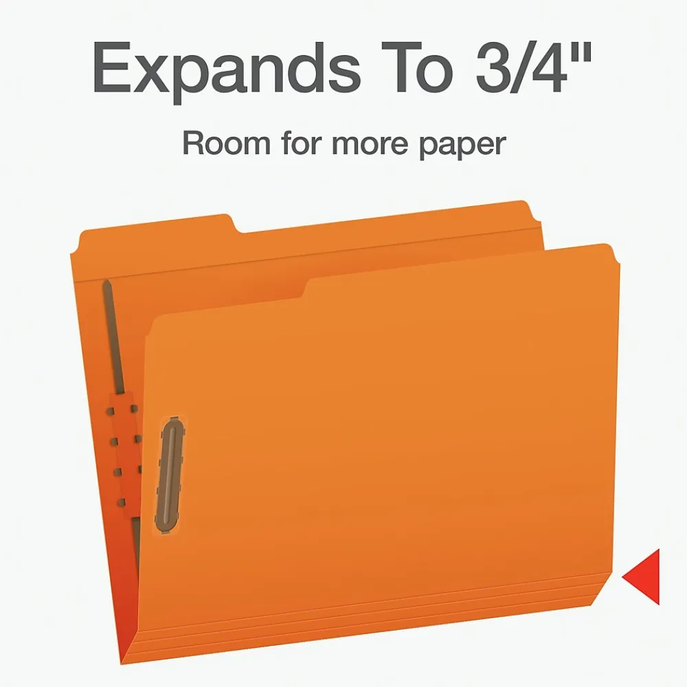 - These reinforced, orange fastener folders have two embedded fasteners to keep your papers in order and in place