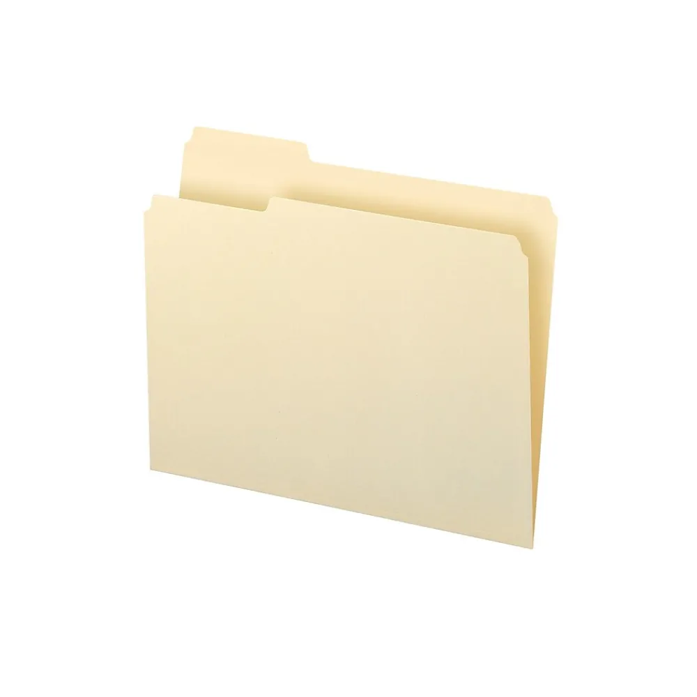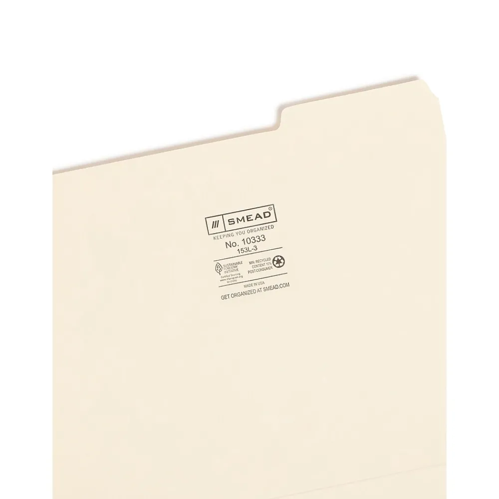 Expand the office filing system with these Smead letter-size manila file folders. The standard thickness manila stock keeps contents safe, while a 1/3-cut tab design provides plenty of space for labels to ensure everything is easy to find. These Smead letter-size manila file folders fit any letter-sized papers and come in boxes of 100, so it’s easy to stock up.