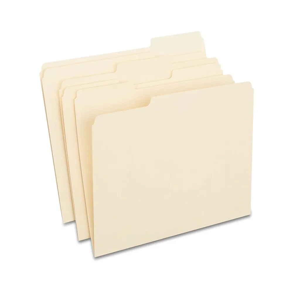 Protect important paperwork with these manila file folders. Thoughtful sizing provides full coverage for letter-size documents, and the 1/3-cut tab layout provides ample space for custom labels. These folders feature sturdy paper construction for convenient reuse. Packaged in 100-count boxes, these Staples 100 percent recycled letter-size manila file folders make it easy to take on bulk filing tasks.