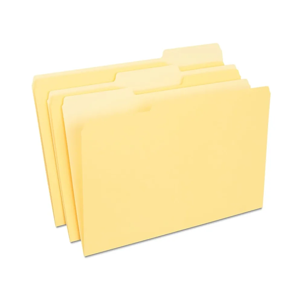 Gather office documents inside these file folders. The yellow hue lets you color-code paperwork for quick reference, and the 1/3-cut tab layout allows for custom labeling. The durable paper construction withstands frequent handling, making these folders conveniently reusable. With thoughtful sizing, these Staples legal-size yellow three-tab file folders accept legal-size pages to meet a range of paperwork storage needs.