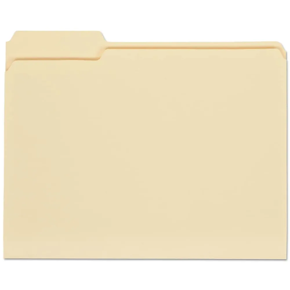 The top tabs are undercut to provide a generous indexing area for detailed labels and titles, and the classic folder construction resists snags and tearing in crowded filing drawers. The 11-point manila material of these Universal top-tab file folders is triple-scored to support large files and prevent sagging.