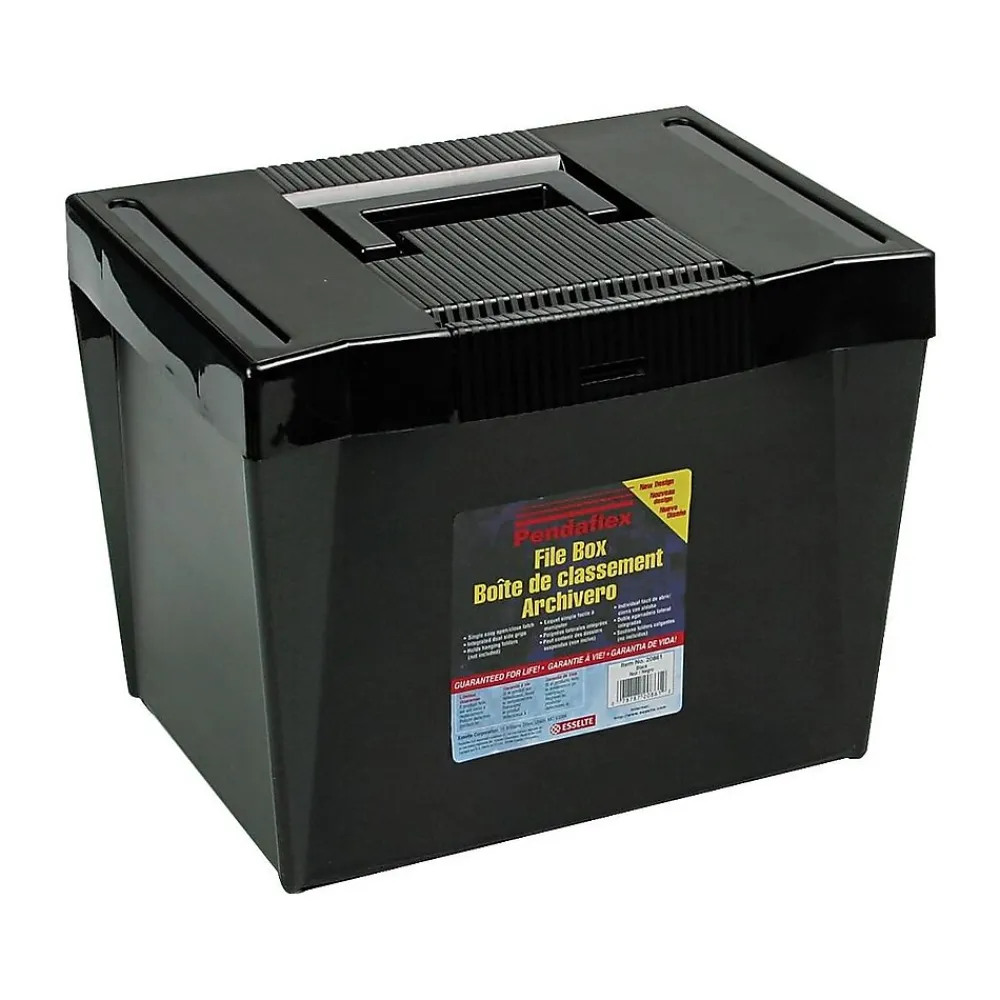Store and carry important documents with this black portable hanging file box. The plastic construction provides strong durability to protect contents from damage while transporting them, and the handle folds into the lid to reduce required storage space. This Pendaflex black portable hanging file box is easy to carry and features a single-latch closure, giving you quick access to hanging files.