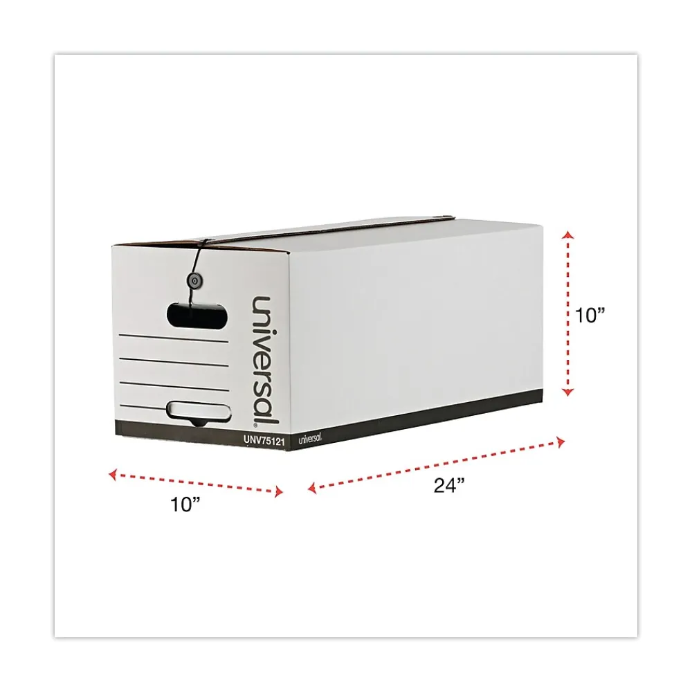 Keep the previous year’s marketing figures secure but within easy reach with this Universal string-and-button box. Fitting letter-size documents, this storage box can be resealed repeatedly, and because the surface is white, it’s easy to note the contents for quick retrieval. This Universal string-and-button box has built-in carry handles for transporting from office to storeroom and is constructed with sturdy corrugated fiberboard that contains 59 percent postconsumer recycled content.