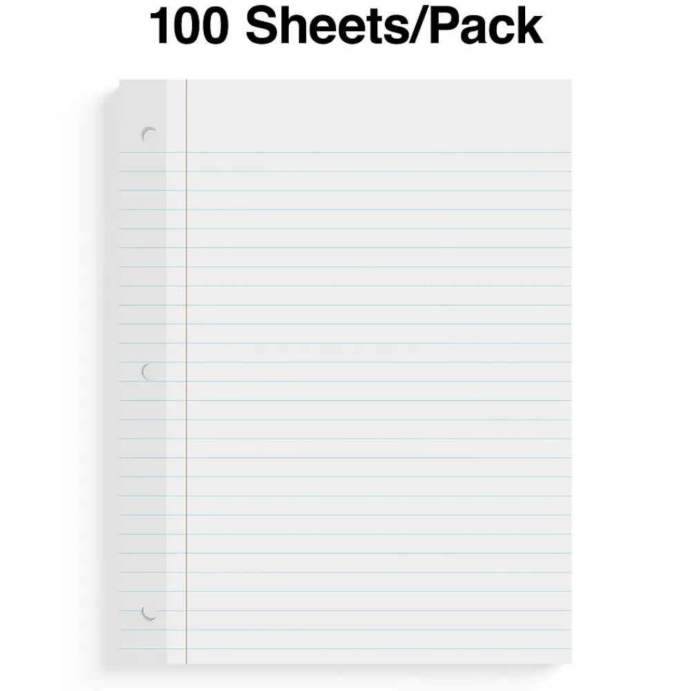Write with large clear letters using this wide ruled filler paper. The standard paper weight is ideal for everyday use in business meetings, planning sessions or for lectures. This Staples Business Essentials 8 x 10.5-inch reinforced wide ruled filler paper comes with 100 sheets per pack to fill your binders and has reinforced punched holes to keep pages from tearing.
