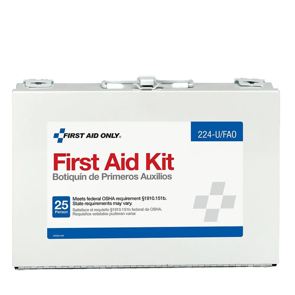 Treat minor injuries with this First Aid Only 25 person first aid kit. The durable metal case features a carrying handle for portability and a wall-mount design for permanent placement in your office. A handy first aid guide walks you through the steps needed to treat cuts, scrapes and burns. Use the gauze, scissors and bandages to dress wounds. Sting relief wipes, eyewash, a cold pack and aspirin tablets provide relief for a range of other injuries. Equipped with a wide assortment of supplies, this First Aid Only 25-person first aid kit provides convenient solutions for a wide range of workplace accidents and medical events.