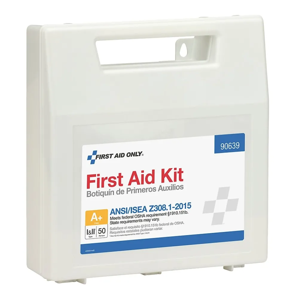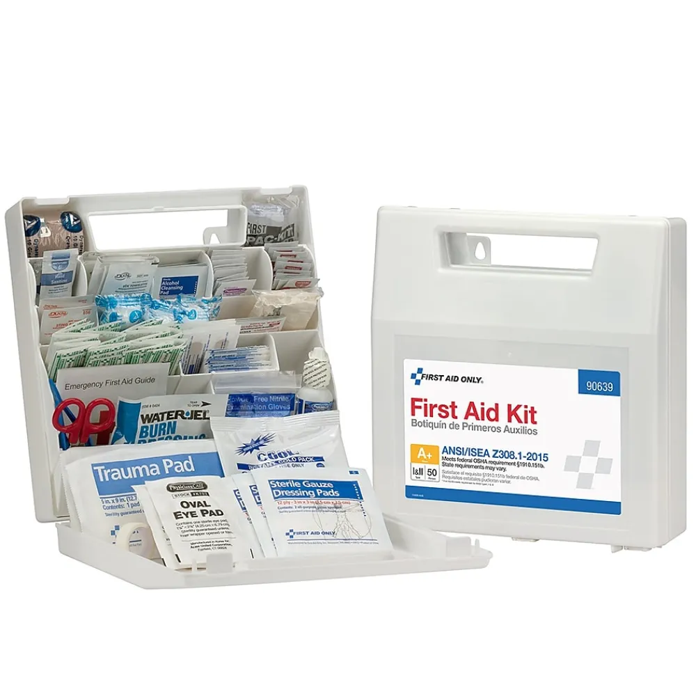 Kit includes 183 pieces and includes bandages, alcohol wipes, tweezers and more. This kit is ideal for almost any workplace and is ANSI and OSHA compliant. Plastic, organized case comes with a carrying handle and is wall mountable. Contents exceed the 2015 ANSI Class A requirements and are sufficient to treat 50 or more people.