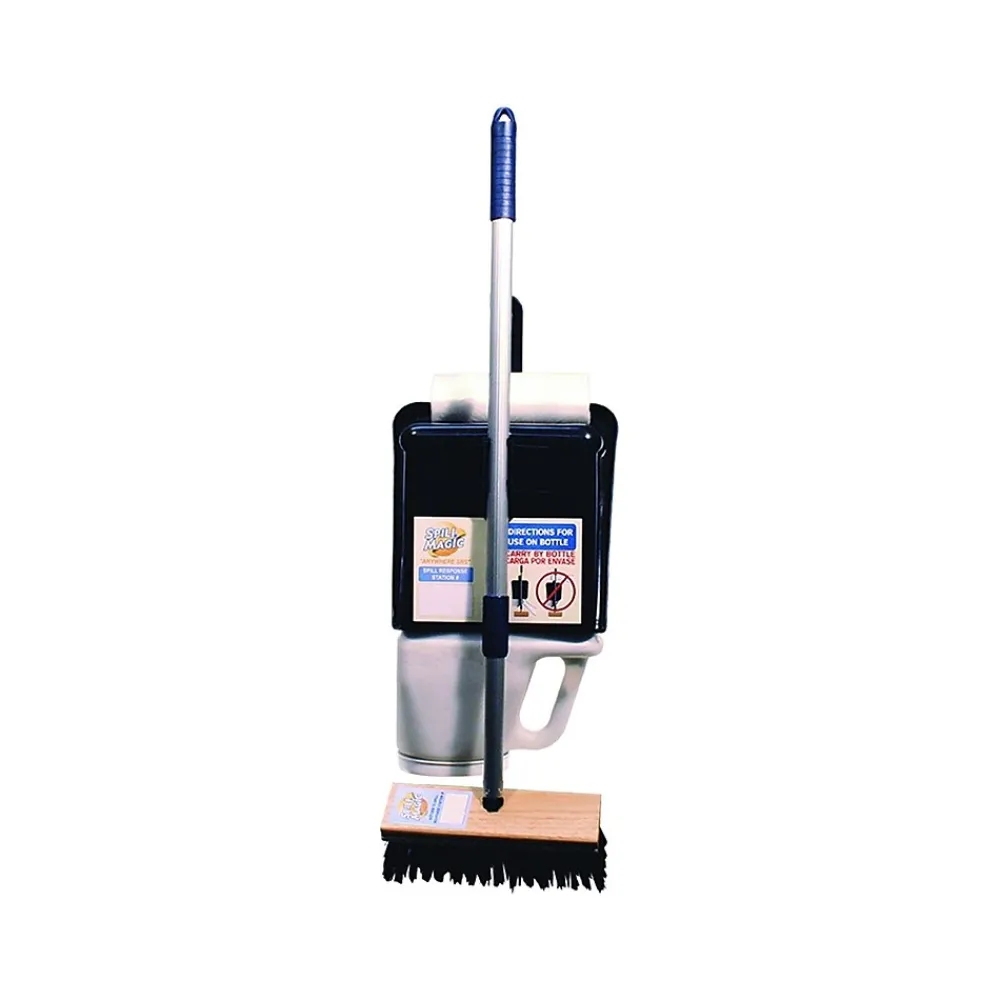 The First Aid Only Spill Magic anywhere spill response station holds all necessary items to quickly clean up spills and prevent slip and fall instances. The system includes a broom with 12″ handle, dustpan, trash liner roll, pocket pads, and a filled 3 lb. bottle of Spill Magic absorbent powder. The custom-molded dustpan locks onto the absorbent powder dispenser bottle, allowing it to fit under a counter, in a drawer, on a shelf, or be mounted on a wall or pole.