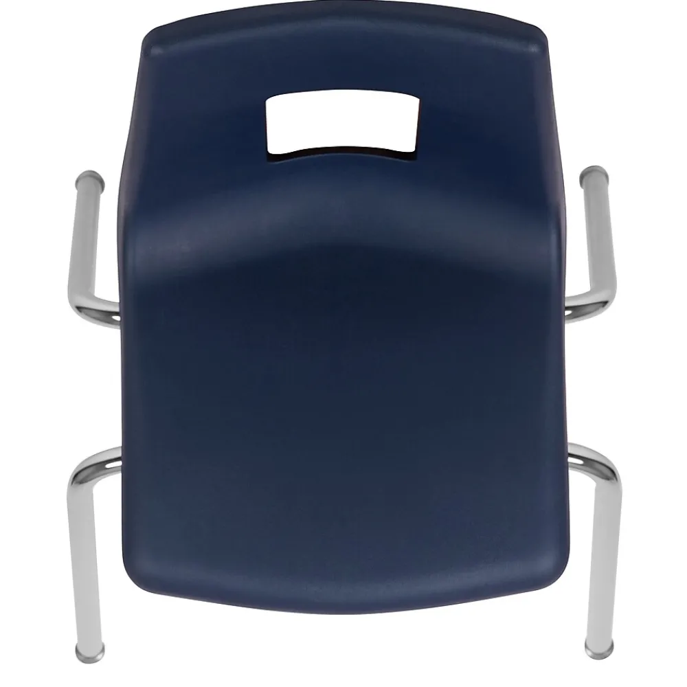 The classroom oriented student stack school chair features a heavy-duty navy seat shell made of superior high-density polypropylene, ergonomically shaped for maximum student seating comfort and 18-gauge bright nickel, chrome plated frame. The seat shell is designed to promote student seating comfort and correct seating posture for enhanced learning. Non-exposed rivets hold the school chair shell to the strong, non-corrosive steel frame while nylon tip glides on each leg help protect delicate floor surfaces. This ergonomic stack chair provides a stylish and durable classroom seating solution.
