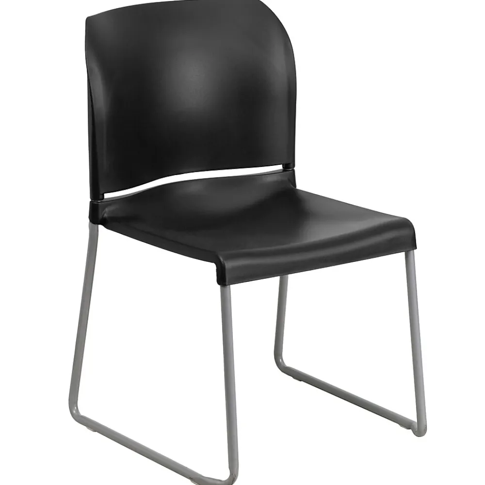 Flash Furniture HERCULES™ ergonomic black stacking chair has a silver powder coated frame finish with contoured polypropylene black colored seat and back for an elegant look. 880 lbs capacity chair has a sled base and is sold as 20 per pack.
