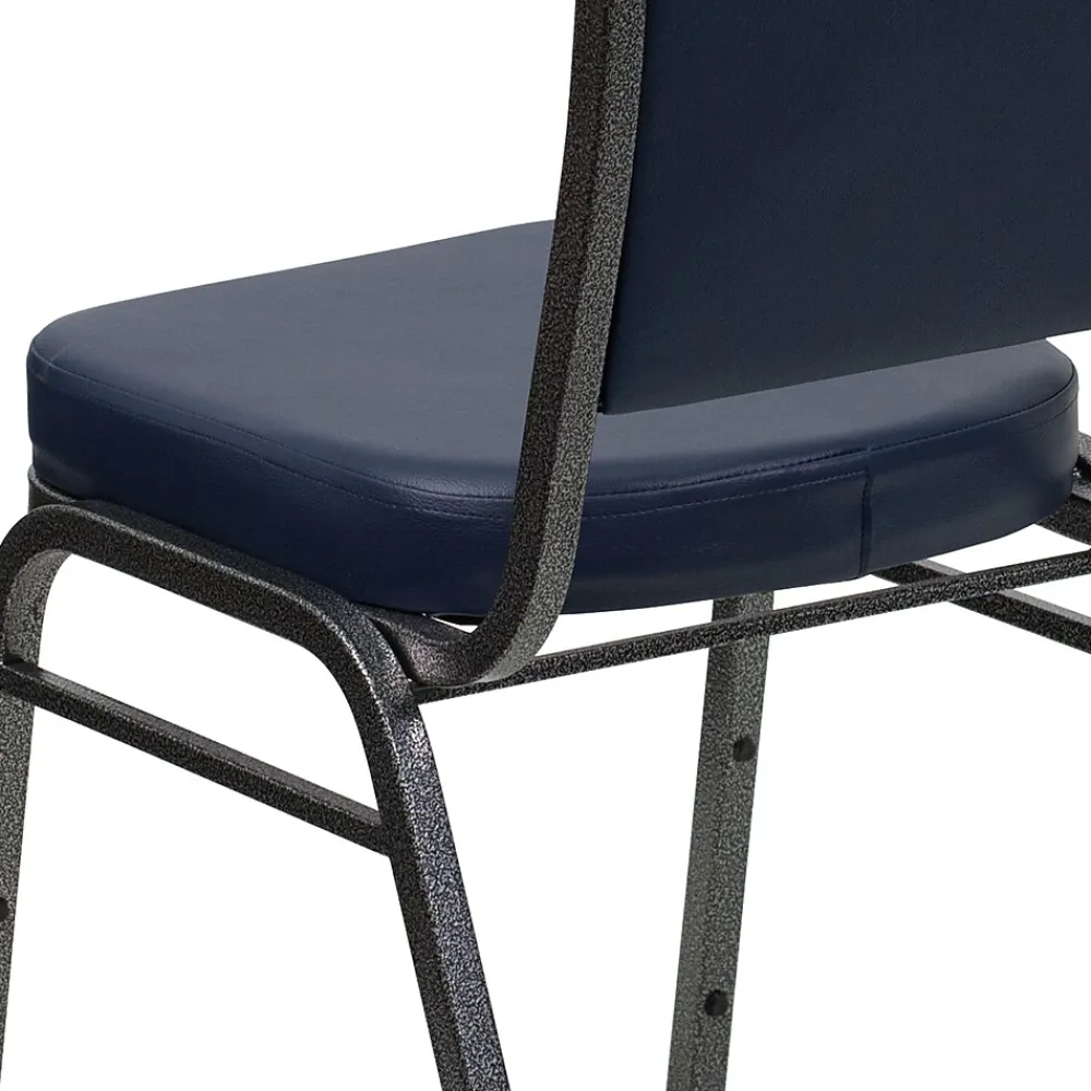 Make an impressive presentation in your banquet hall when clients come to visit your facility with these ballroom chairs. Built for the commercial industry these popular crown back banquet chairs with 16 gauge steel frame have been tested to hold up to 500 pounds. With a high seating capacity these stack chairs are perfect for the event rental business, banquet halls, churches, and schools. This hospitality chair can be dressed up with chair covers. The chair is cushioned with 2.5″ thick CAL 117 fire retardant foam and is covered in a durable, easy to clean vinyl upholstery. Bumper guards prevent scratches on the frame when stacked (up to 15 high) and non-marring floor glides protect your floor. This stacking upholstered stack chair is an excellent option for any commercial setting. Add banquet chairs to your home dining table to add a contrasting look to your dining room or kitchen.