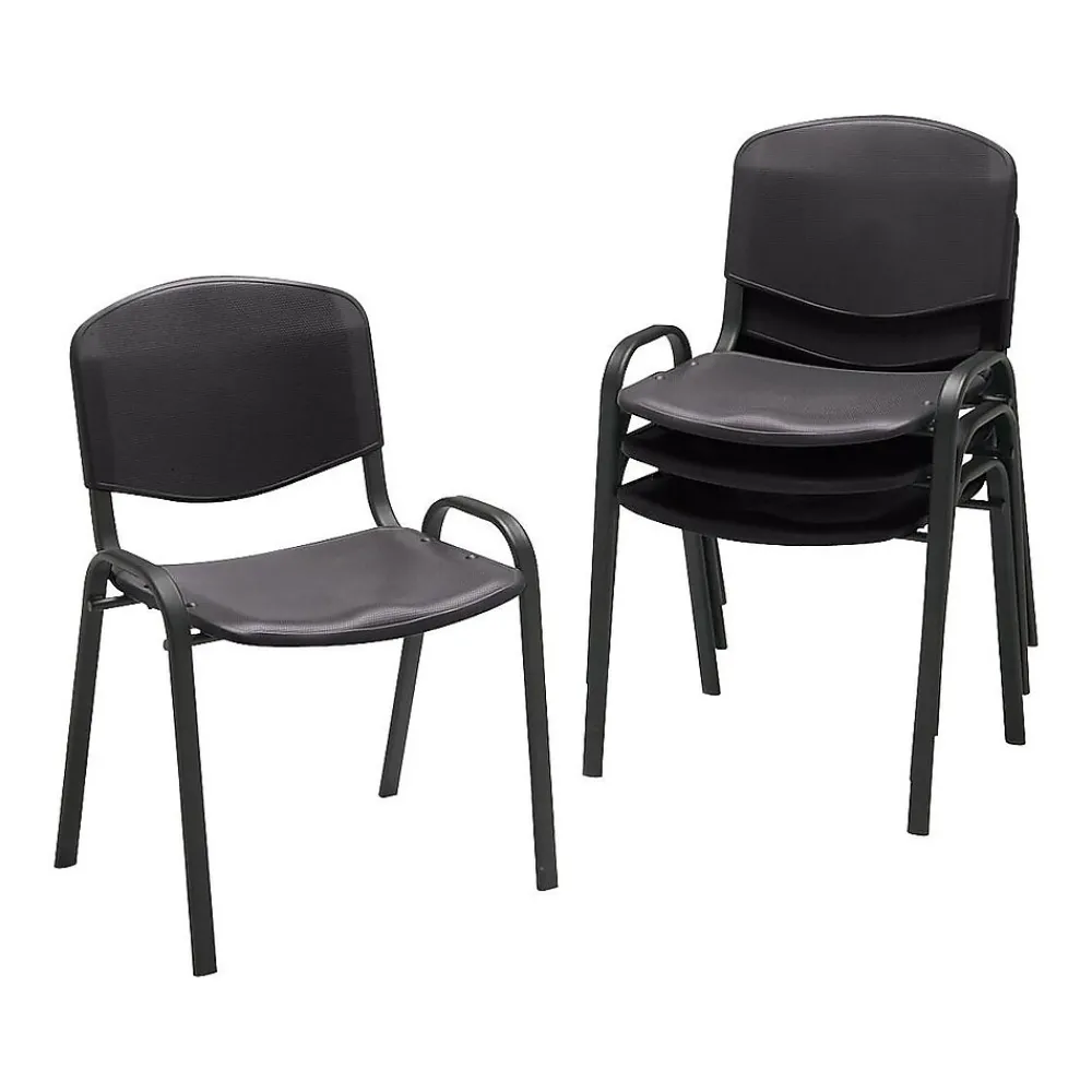 Adorn the reception area with these stylish, black chairs. Each seat and back is contoured with high-impact polypropylene material for extra support and durability, and the sturdy steel frame’s legs have plastic glides to protect floor surfaces. These lightweight Safco chairs are stackable to save space when stored.