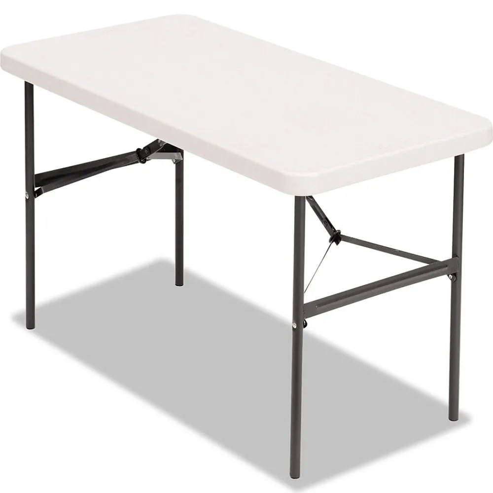 United Stationers® 29″ Banquet folding table in platinum/charcoal color is made of blow molded high density polyethylene top to resist scratch/dent/water. Table has heavy gauge, powder coated round legs for additional strength.