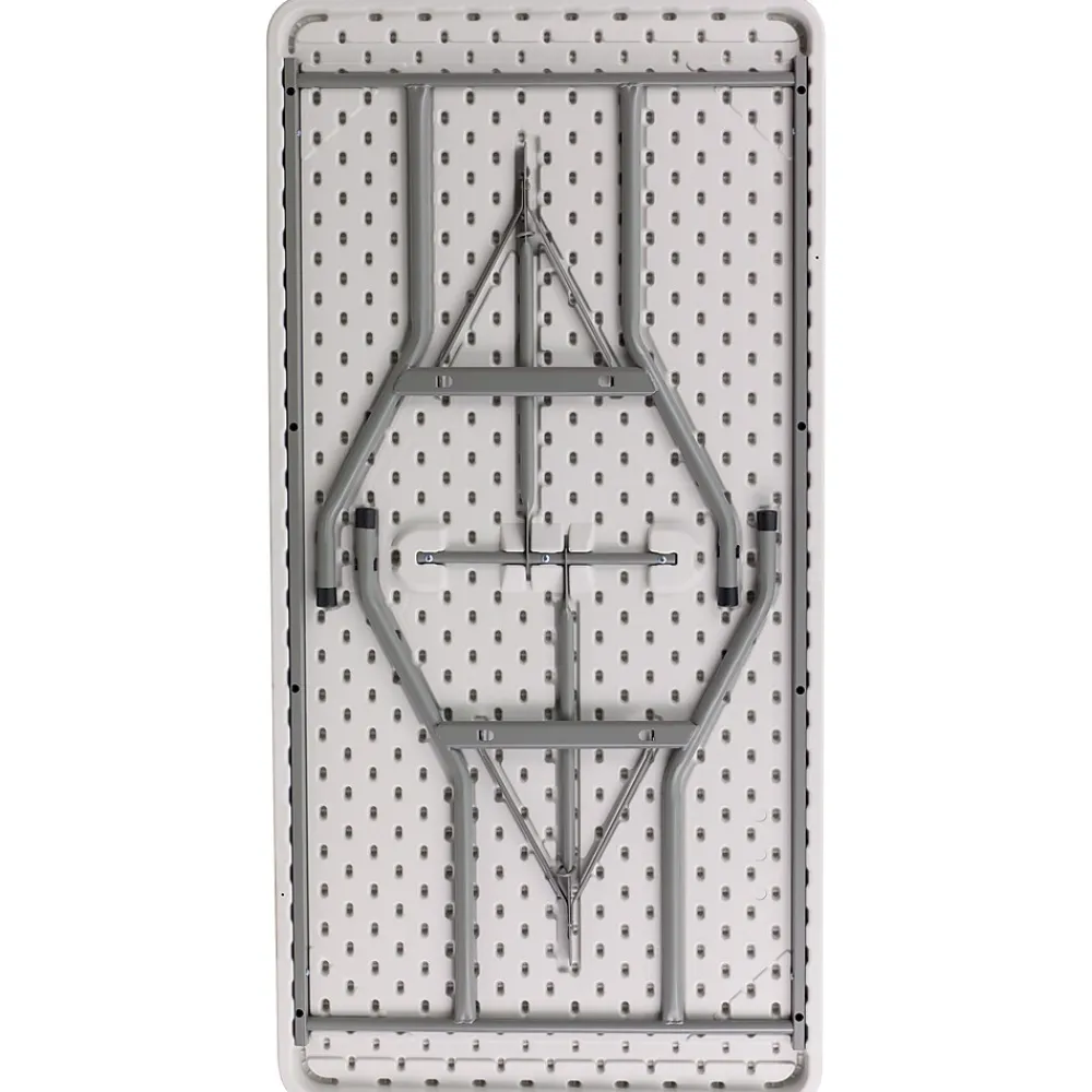 Rectangular folding tables are essential to anyone who setup displays promoting their products or hosts parties regularly. This 5′ long banquet folding table fits well in classrooms for team building exercises and computer lab work. The table can fit up to 6 people for collaborative learning sessions. This commercial grade folding table is often used in banquet halls, warehouses, conference centers, and at trade shows. Caterers will have ample space to layout meals for guests to be served, cover up with white linen for a professional appearance. Floors remain scratch-free by the protective floor caps. Once you’re done the legs lock underneath the tabletop to be transported and stored away. Easy to clean and store, plastic folding tables are popular for any occasion. Although designed for indoor events this party table can be used outdoors on the deck or patio during good weather but must be stored indoors.