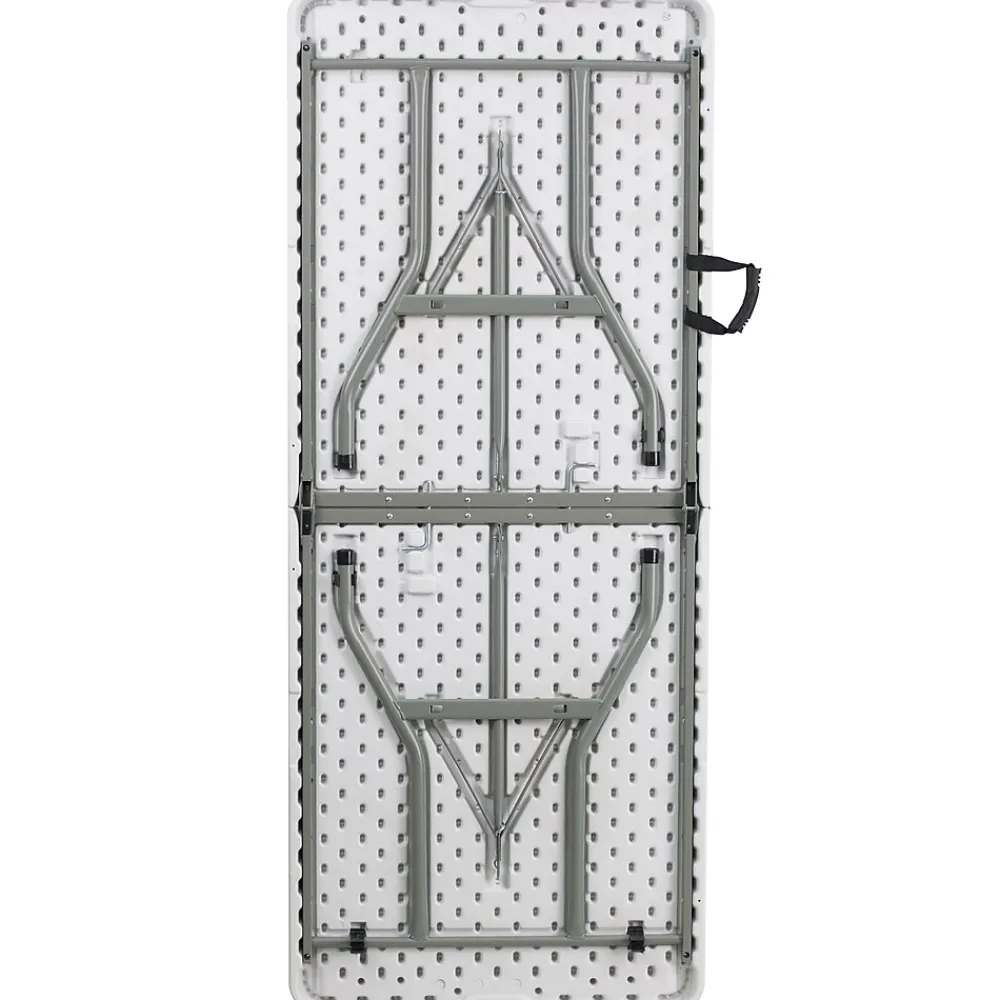 Advertise your business and products at the Expo on this portable folding table. This 6′ long banquet table accommodates up to 8 people and seats extra guests during holiday gatherings. Built for commercial use this heavy-duty folding table makes appearances in restaurants, warehouses, schools, churches and rec centers. Folding tables can be used for all your sit-down activities and their legs lock when folded for storage. This versatile centerfold table can be dressed up during holiday events and parties. If you have hard flooring at your banquet hall the floor caps prevent scratches and glide smoothly across floors. Easy to clean and store, plastic folding tables are the best option for any occasion. Although designed for indoor events this party table can be used outdoors on the patio during good weather but must be stored indoors. Get your ready to use rectangular folding table for your home or business today.