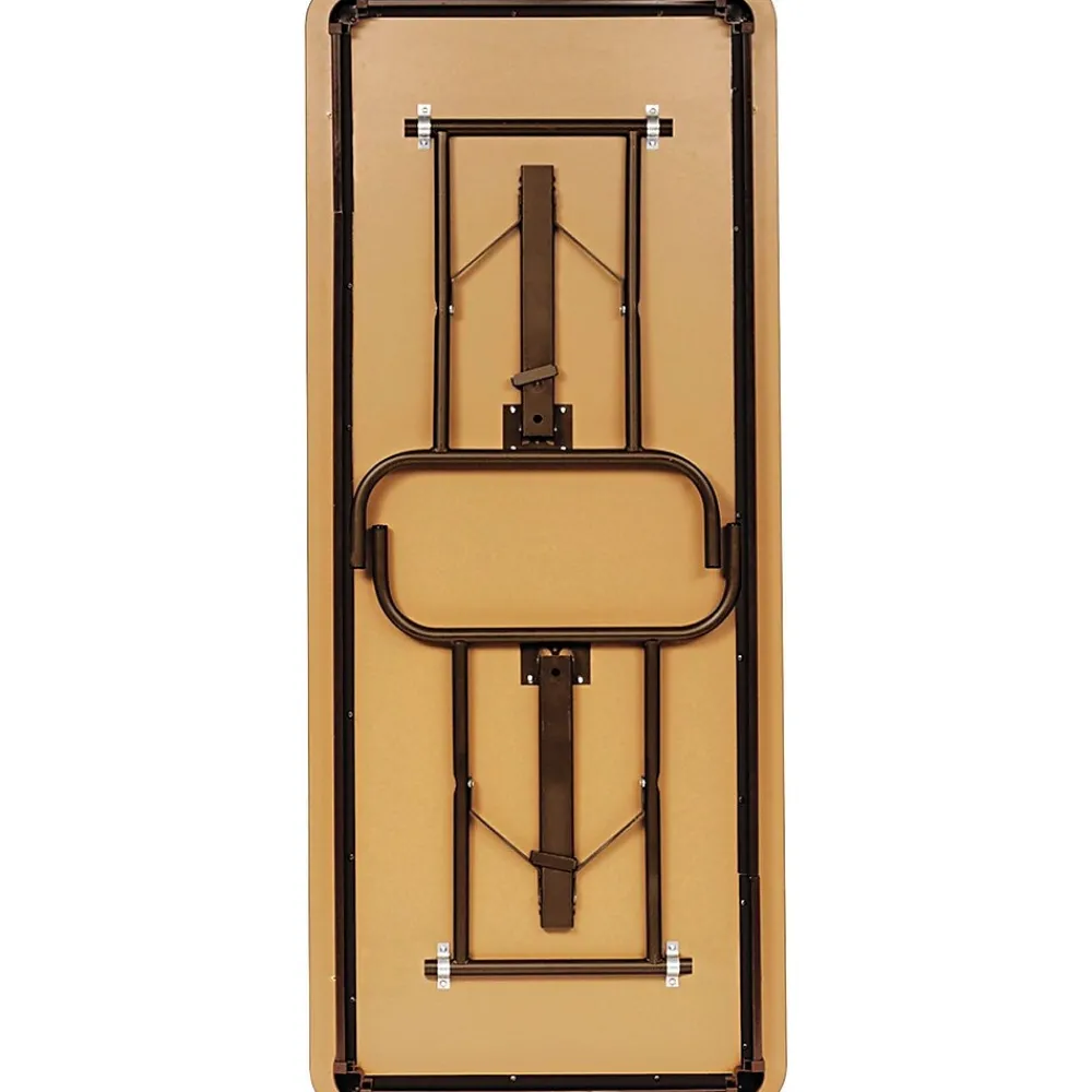 - Folding tables feature a wear-resistant, 3/4″ top surface; laminated melamine over particle board with a melamine-sealed underside and bull-nose vinyl T-mold edging