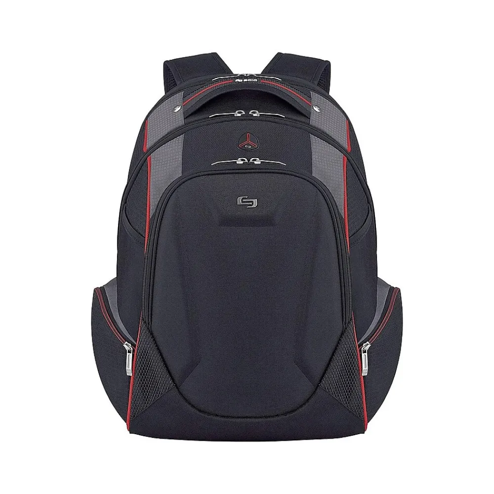 Give your personal electronics durable protection when you pack them inside this black and red backpack. A fully padded 17.3-inch laptop compartment shields your device against accidental bumps, while the dedicated pocket offers a perfect place to stash your tablet. A handy headphone port makes it easy to stay connected during phone calls or listen to favorite playlists. This laptop boasts zippered side pockets to accommodate small items or water bottles. The hardshell zip-down organizer keeps smartphones and other small devices safe from damage. Featuring a padded back and cushioned straps, this Solo New York Force Launch backpack provides added comfort as you journey to and from school or work each day.