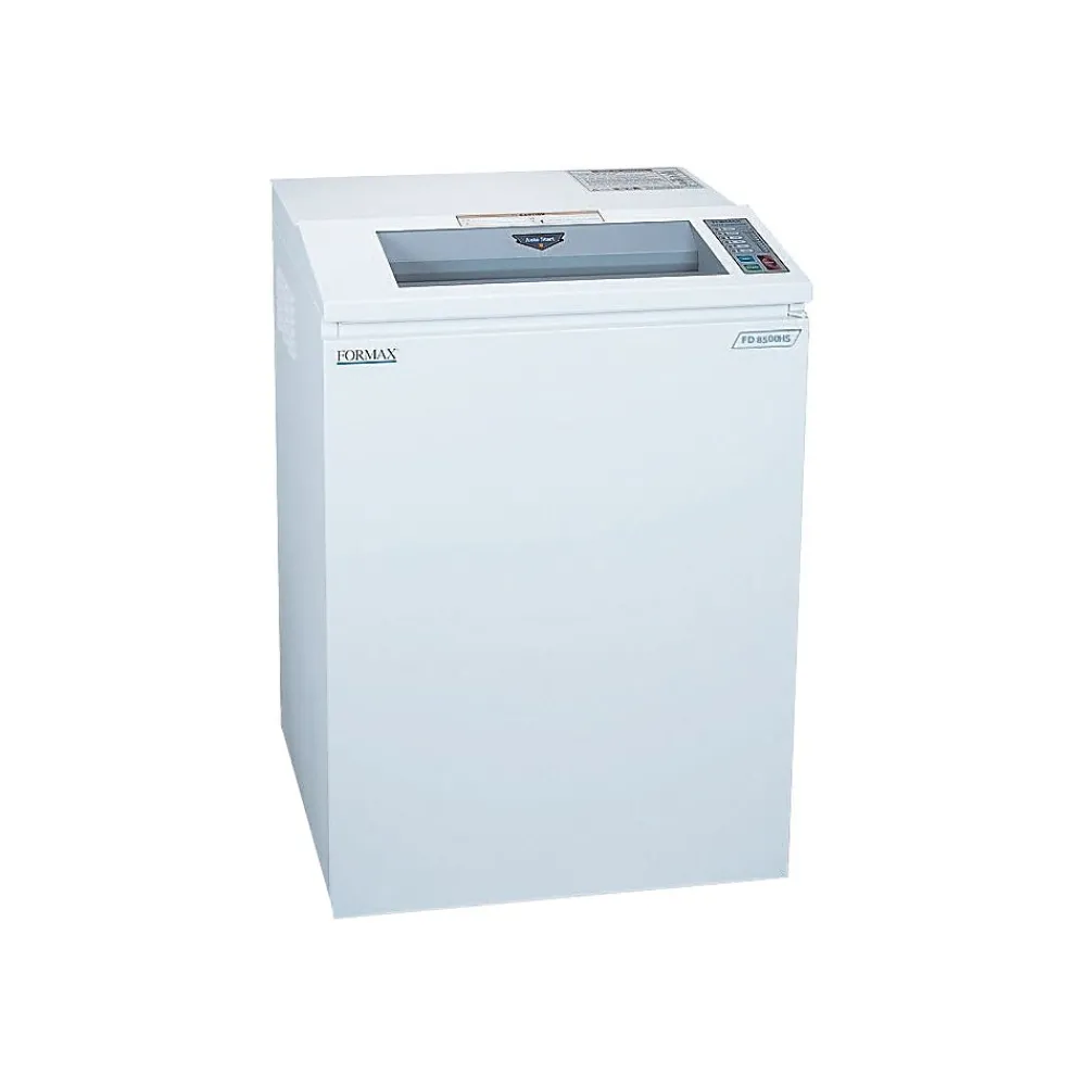 The Formax FD8500HS high-security office shredder offers security with a 16″ feed opening combined with commercial-grade components in a sleek, practical design. An easy-to-use LED control panel puts the power right at your fingertips. The FD8500HS crosscut model can shred up to five sheets at a time, up to 35 feet per minute, with a shred size of 1/32″ x 3/16″. The FD8500HS meets the requirements of NSA/CSS Specification 02-01 for Level 6 (P-7) high-security crosscut shredders. In addition, the Eco mode saves energy by automatically switching into standby mode after 5 minutes of inactivity. Commercial-grade features include heat-treated steel blades, a steel cabinet, lifetime-guaranteed waste bin, and a powerful AC geared motor ensuring years of reliable performance and information security.