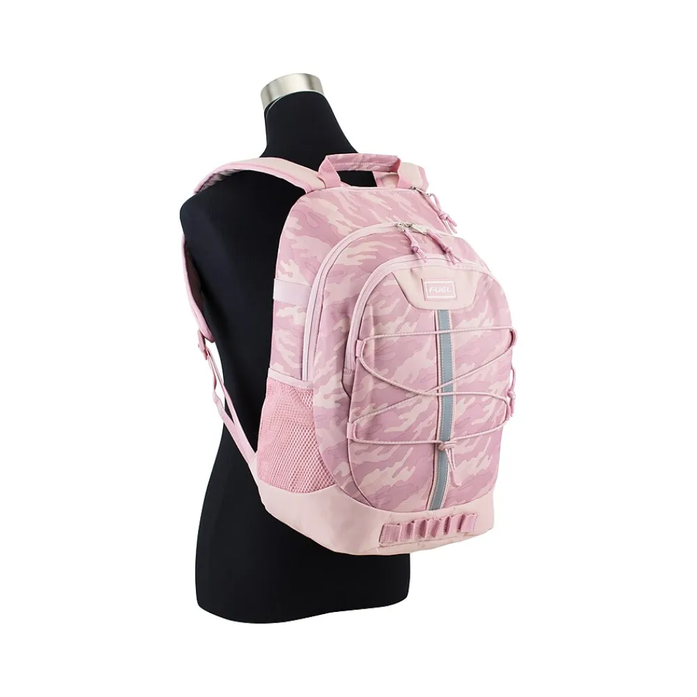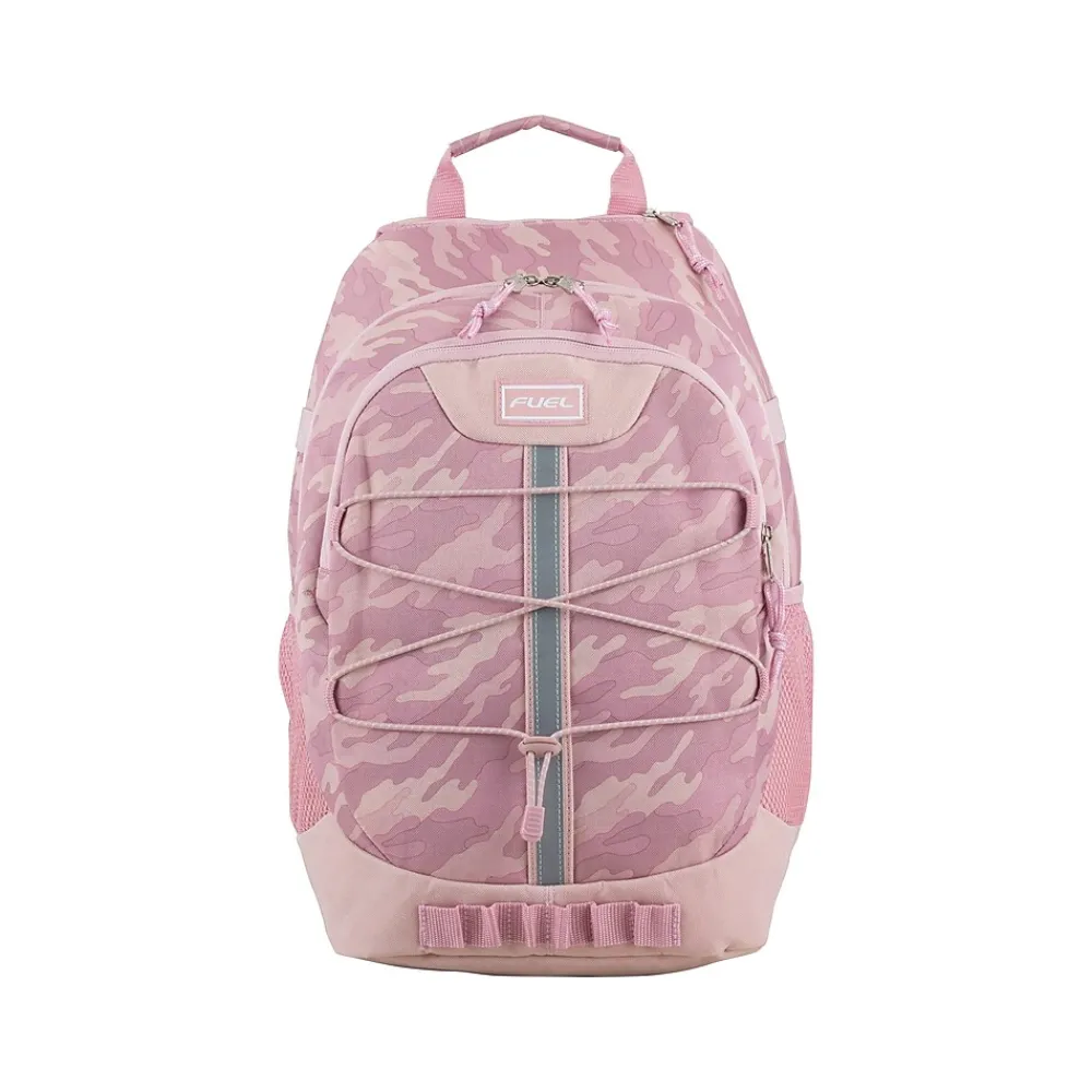 The FUEL Terra Sport Bungee backpack features a large double-zip compartment with padded laptop sleeve, smaller zip compartment, quick-access felt-lined electronic/sunglasses pocket, twin side water bottle pockets, front bungee with reflective safety strip, daisy chain accents, ergo foam padded back, and shoulder straps. The water-resistant heavy-duty 420D nylon construction holds up to the elements, making this durable backpack perfect for school, sports, and any outdoor activities.