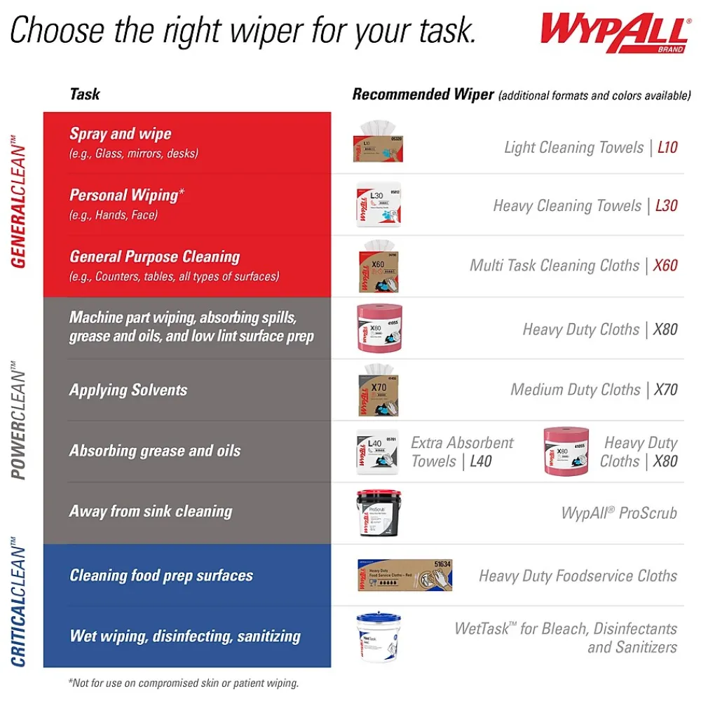 - WypAll® General Clean X60 Multi-Task Cleaning Cloths are absorbent and reinforced to stay strong for cleaning performance in light duty tasks; they absorb water faster than rags