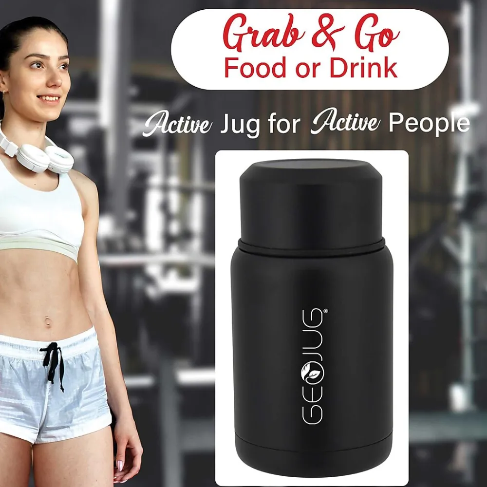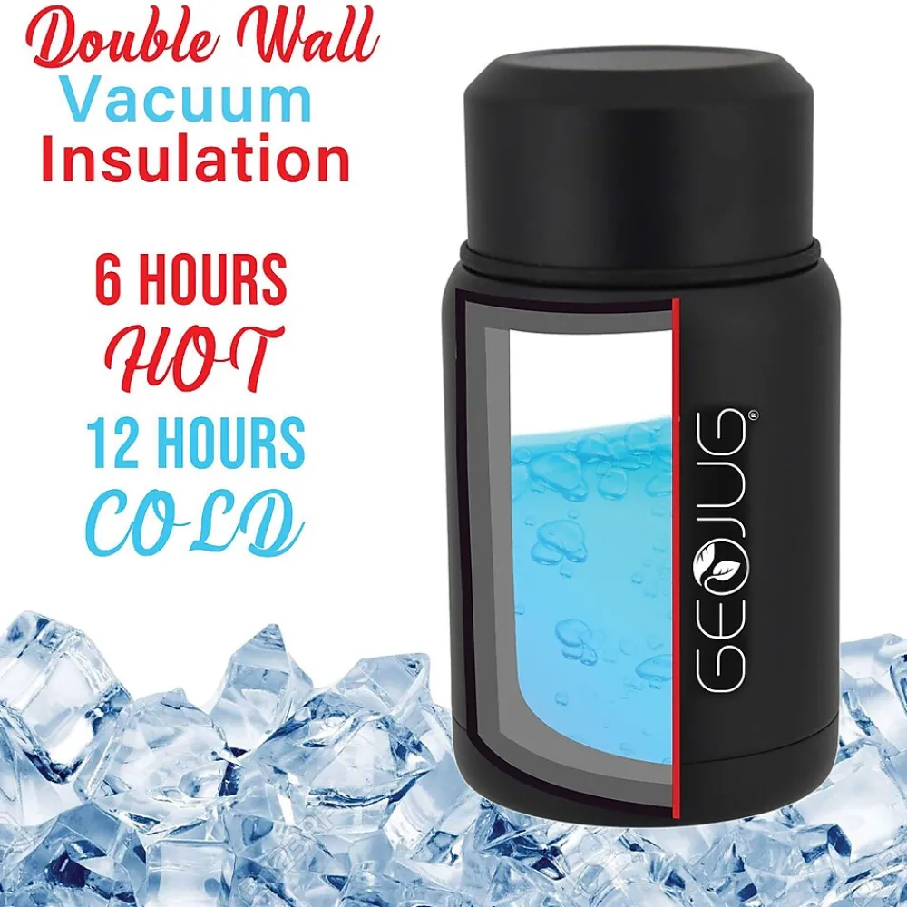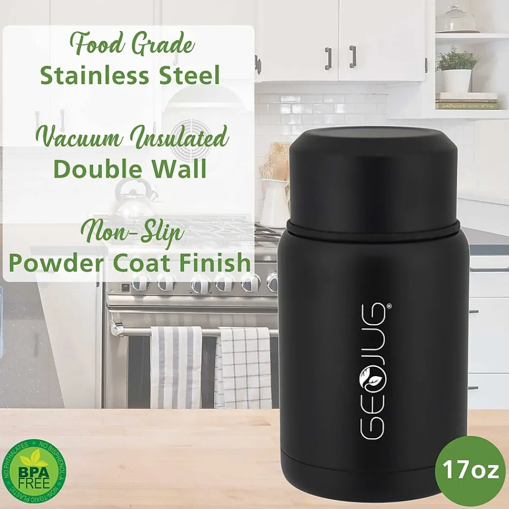Use the Brentwood® Geojug 17-Oz. Vacuum Insulated Stainless Steel Food Jar with Bowl and Folding Spoon to keep food or drinks hot or cold for hours. Always enjoy the pure taste of your food and drink thanks to tasteless and odorless pro-grade stainless steel construction. The jug features a wide mouth for quick filling and easy cleaning. Serve yourself a bowl of food or soup or share drinks with friends. The outer screw on lid can be flipped over and used as a bowl or cup. The included folding stainless steel spoon stores inside the interior lid. Double-wall vacuum insulation ensures the food jar never sweats. The food jar has a jet black finish for a modern aesthetic.