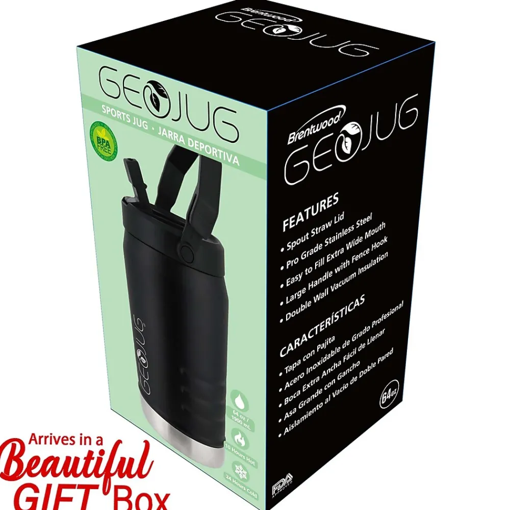 Use the Brentwood® Geojug Stainless Steel Vacuum Insulated Sports Water Jug to keep your favorite beverages hot up to 10 hours and cold up to 24 hours with no condensation. Always enjoy the pure taste of your drink thanks to tasteless and odorless pro grade stainless steel construction. An extra wide mouth is ideal for quick filling and easy cleaning. The thin and durable powder coat finish insures a slip free grip. It includes a uniquely designed spout straw lid with built-in, extra-large carry handle. Conveniently hang the sports jug on a chain link fence using the integrated fence hook on the handle. Stand out with this great insulated water bottle.