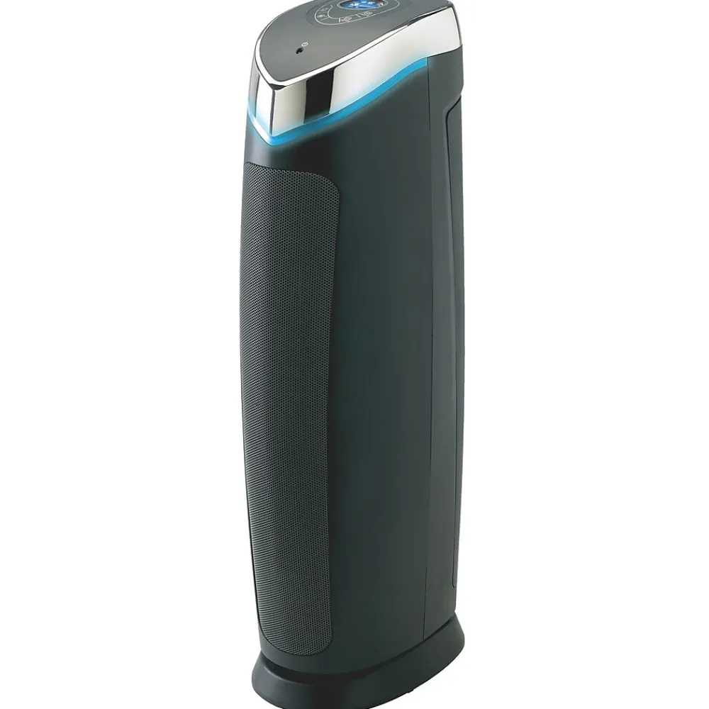 The 3-in-1 True HEPA Air Purifier is perfect for allergy sufferers. True HEPA captures 99.97% of allergens including pet dander, dust mites and pollen. The Pet Pure is an antimicrobial agent added to the filter to inhibit the growth of mold, mildew and odor-causing bacteria on the surface of the filter. According to the American Academy of Pediatric Allergy and Immunology, doctors recommend HEPA air filtration to reduce exposure to indoor asthma triggers. More than just a filter, the UV-C light kills germs, while the charcoal filter captures odors. CADR Rated 125+ and standing 28″ tall, it is lightweight and ideal to use in both medium to large rooms. The easy to use digital display panel includes UV-C control, a filter change indicator and an up to 8 hour timer. Five speeds provide high speed allergen control down to ultra-quiet sleep mode.