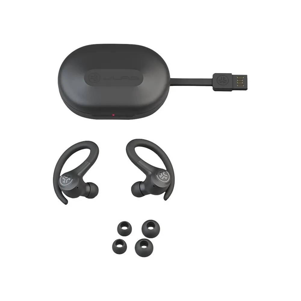 Power through your hardest or easiest workout. With more than 32 hours of total playtime and small sport fit, this pair of JLab GO Air Sport earbuds is mighty (and fun). Auto connect to your device to walk, run, HIIT, or talk on the go. This pair of earbuds offers over 8 hours of playtime in each earbud and over 24 extra hours from the charging case (more than 32 hours in total). Return to the case to recharge the buds, and use the integrated USB cable to charge the case. An IP55 rating sweat resistance holds up against sweat and dirt, so hit the trails, the gym, and more. The ergonomic ear hook fits even the smallest ears and stays securely and comfortably in place. Try all sizes of the gel tips to get a secure fit and just go. Use either earbud independently, or use both together. A built-in MEMS microphone in each bud ensures clear calls. With just a few taps via touch sensors, you can choose your sound preference (JLab Signature, Balanced, and Bass Boost modes) without an app. Enjoy volume and track controls, plus play/pause, answering calls, and activating your smart assistant with the touch control functions.