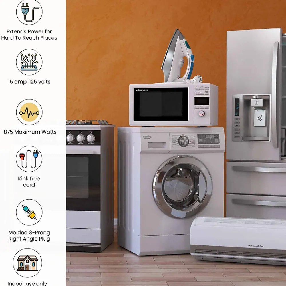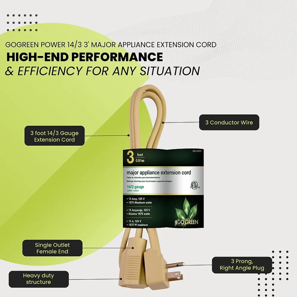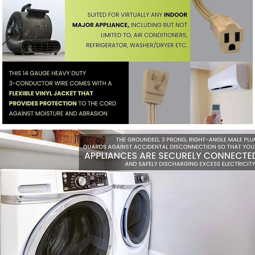 Make sure any cord can reach the plug with a 14/3 appliance cord from GoGreen Power. It can be used with a number of different appliances, such as an air conditioner, washer and dryer, dishwasher or a fridge. The beige extension cord features a grounded three prong head.