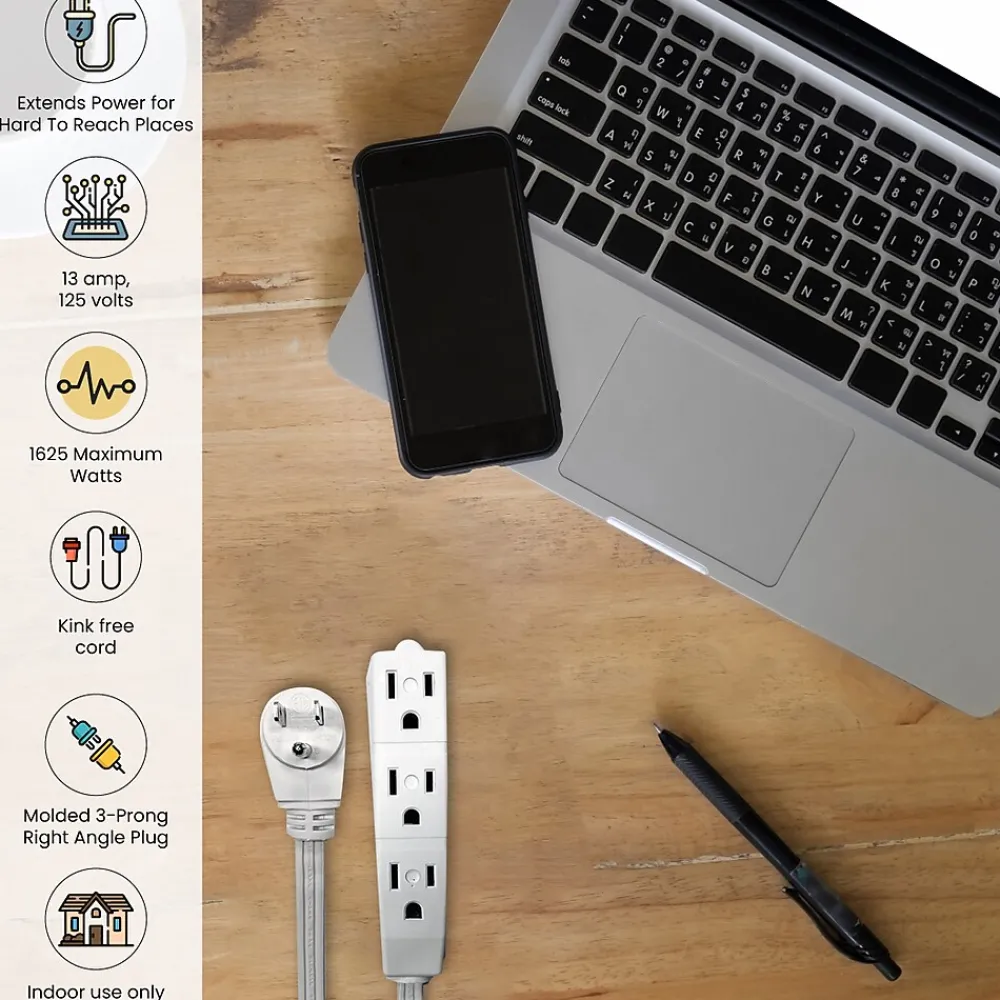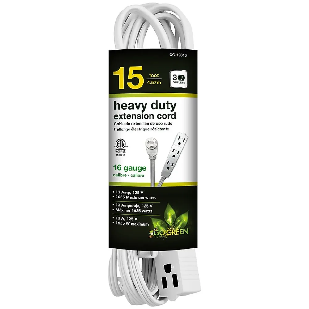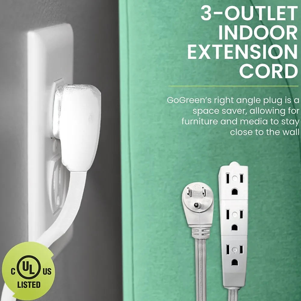 The GoGreen Power 15-foot 16/3 3-outlet extension cord is slim and reduces clutter. It quickly turns one outlet into three and is ideal for small home appliances and general household electronics.