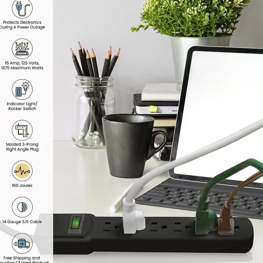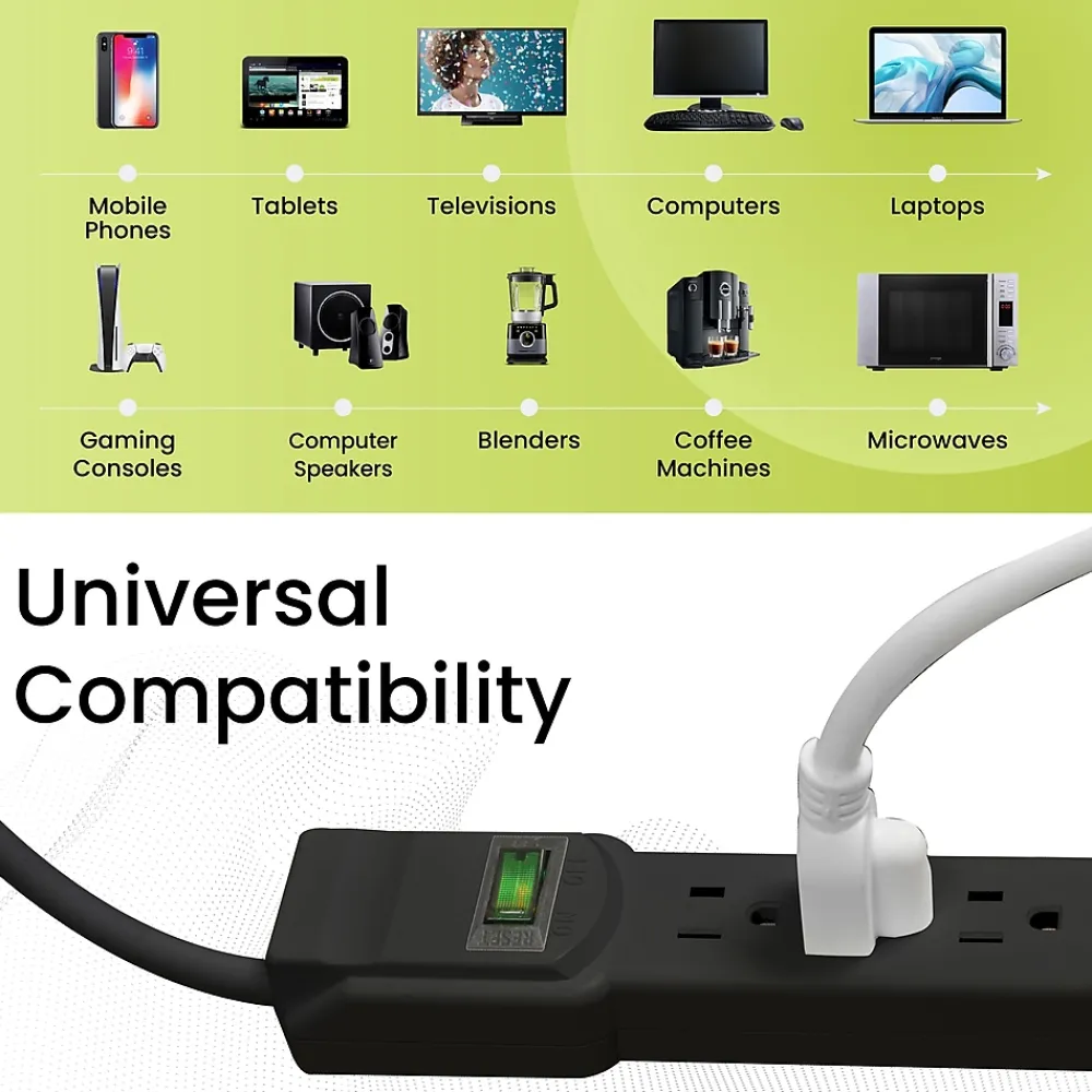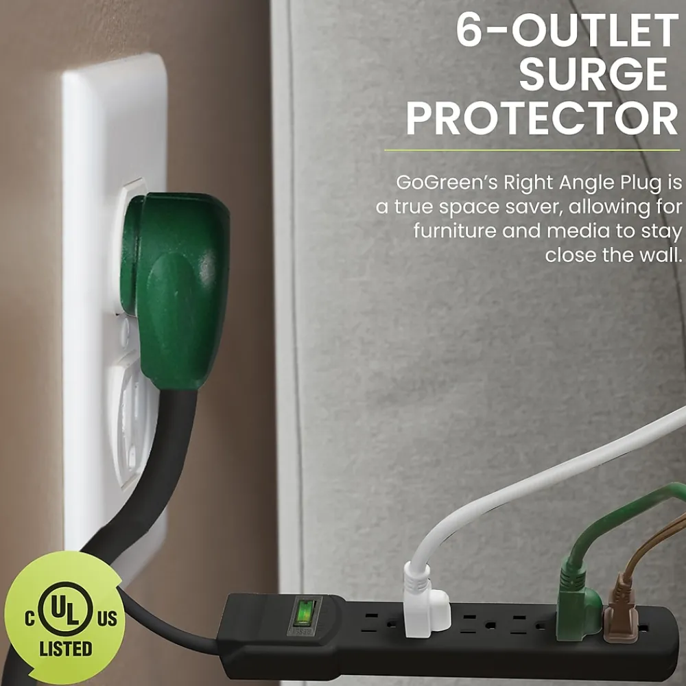 Most people have surge protectors laying around without realizing they are missing critical protection from power outages by storms or brownouts. Protecting your computers, televisions, home appliances, and more isn’t optional – it’s essential!With the GoGreen Power® 6-Outlet Surge Protector, you won’t have to wonder if your devices are protected every time the lights flicker. This 15 amp, 1875 watt circuit breaker provides 90 joules of simultaneous protection for six adapters at once, making it a perfect accessory for your home office or entertainment center. With an active indicator light to confirm protection, the 6-Outlet Surge Protector should be a standard feature in every room in your home.Bolstered by a heavy-duty case and cord, the GoGreen 6-Outlet Surge Protector provides the environmentally-friendly design of all GoGreen products with high-end performance and efficiency for any situation.