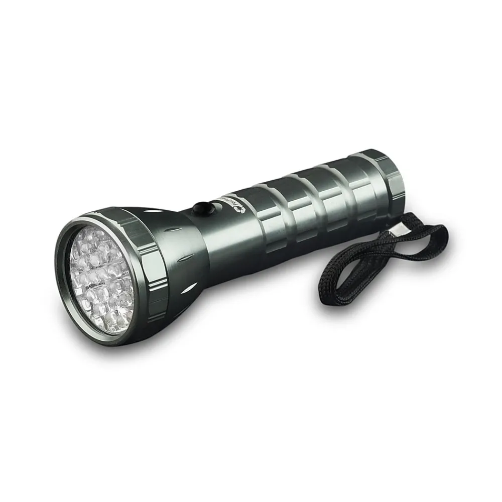 The 28 LED high-intensity flashlight by GoGreen Power is professional grade and utilizes brightest white LED technology to deliver a powerful focused beam. Manufactured with a heavy duty aluminum structure, shatterproof lens and easy grip comfort handle. Works best with 3 AAA GoGreen Power batteries (included).