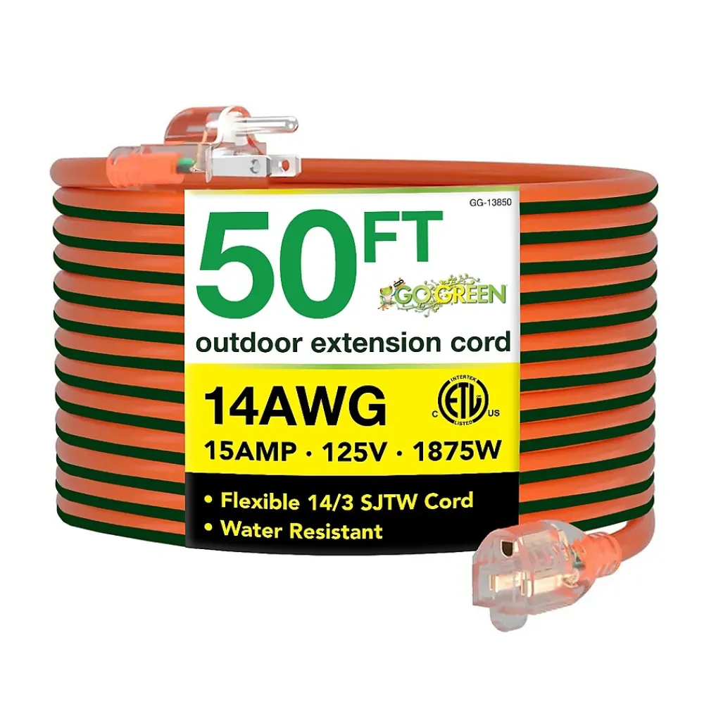 The GoGreen Power Heavy-Duty Extension Cord is ideal for multiple applications around your home’s exterior and garage. It resists moisture, abrasion and exposure to sunlight. The length of the outdoor extension cord allows you to cover a large area without the need for continuous stops to remove and replug. Use it to power your electric tools, lawn mower, to operate your generator and to provide lighting and music while entertaining. The cord is ETL listed and features a light on the end that shines when it’s in use.