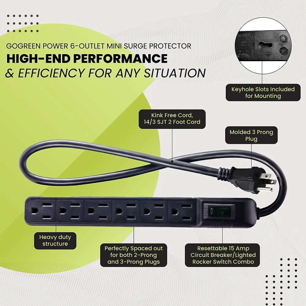 Most people have surge protectors laying around without realizing they are missing critical protection from power outages by storms or brownouts. Protecting your computers, televisions, home appliances, and more isn’t optional – it’s essential!With the GoGreen Power® 6-Outlet Mini Surge Protector, you won’t have to wonder if your devices are protected every time the lights flicker. This 15 amp, 1875 watt circuit breaker provides 90 joules of simultaneous protection for six adapters at once, making it a perfect accessory for your home office or entertainment center. With an active indicator light to confirm protection, the 6-Outlet Mini Surge Protector should be a standard feature in every room in your home.Bolstered by a heavy-duty case and cord, the GoGreen 6-Outlet Mini Surge Protector provides the environmentally-friendly design of all GoGreen products with high-end performance and efficiency for any situation.