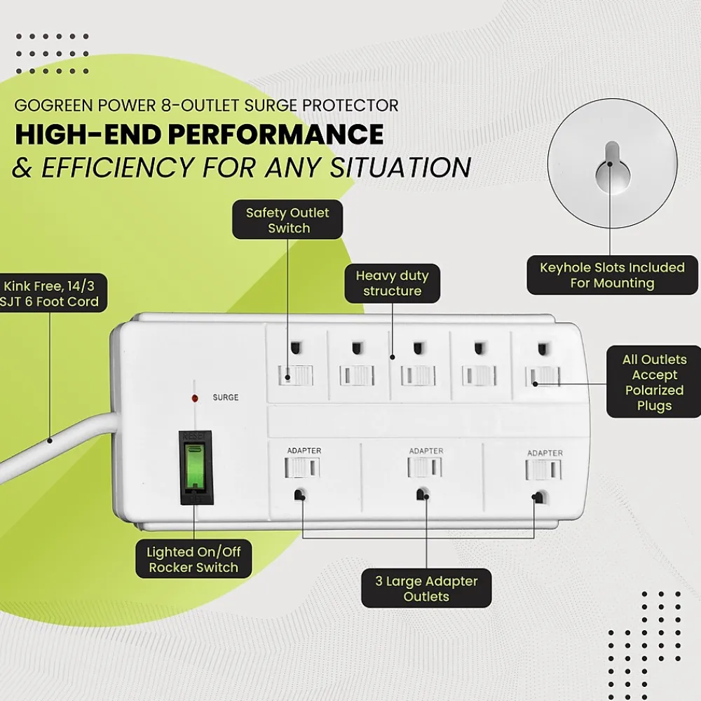 What’s the point of buying high-end electronics if they can all be wiped out by unpredictable occurrences like a bolt of lightning or a brownout? Protecting your computers, televisions, home appliances, and more isn’t optional-it’s essential.With the GoGreen Power® 8-Outlet Surge Protector, you won’t have to wonder if your devices are protected every time the lights flicker. This 15 amp, 1875 watt circuit breaker protects five standard outlets and three large adapters at once. With industry standard EMI/RFI shielding and an active indicator light to confirm operation, you’ll never have to wonder about performance or safety.Coupled with the convenient right-angle plug, the environmentally-friendly design of all GoGreen products combine form and function in a top-notch design geared for maximum safety and efficiency so you can focus on the essential things in life.