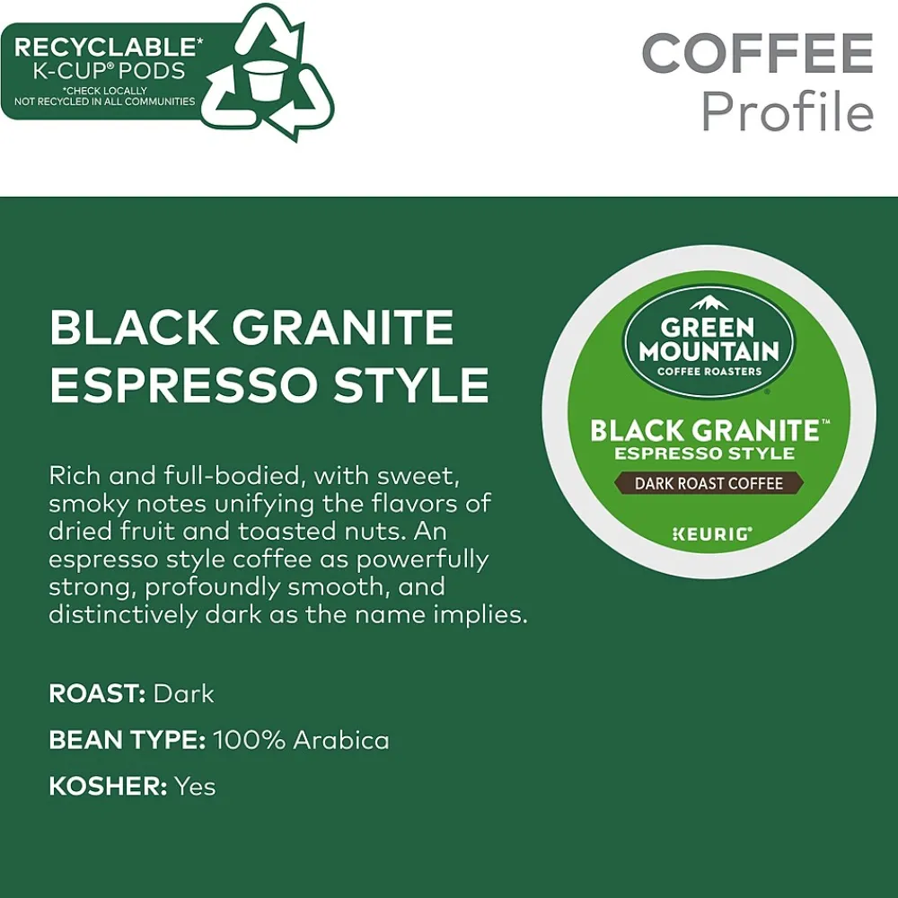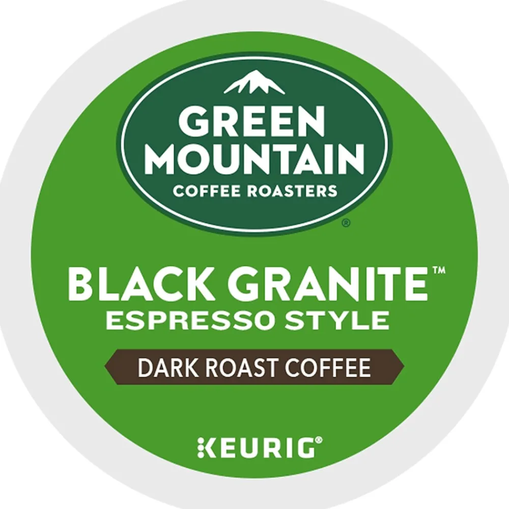 Take to the mountains from the comfort of your kitchen with Green Mountain Black Granite Espresso Style. Rich and full-bodied, with sweet, smoky notes unifying the flavors of dried fruit and toasted nuts, this espresso-style coffee is as powerfully strong, profoundly smooth, and distinctively dark as the name implies. Each sip is an exploration of expertly crafted beans, roasted to perfection. This single-serve K-Cup pod is filled with freshly ground, 100% responsibly sourced 100% arabica beans ready for your Keurig single-serve K-Cup pod coffee maker. Plus, the pod is recyclable. The Green Mountain Black Granite Espresso Style dark roast is the flavorful escape you’ll enjoy with peace of mind, time and time again. Green Mountain is driven to bring the world a richer, better cup of coffee. From the genuine K-Cup pods, optimally designed to deliver an elevated coffee experience at the press of a button, to your favorite awaiting coffee mug, cheers to the adventure of what’s next. Be bold. Be alive. Grab a cup and get out there.