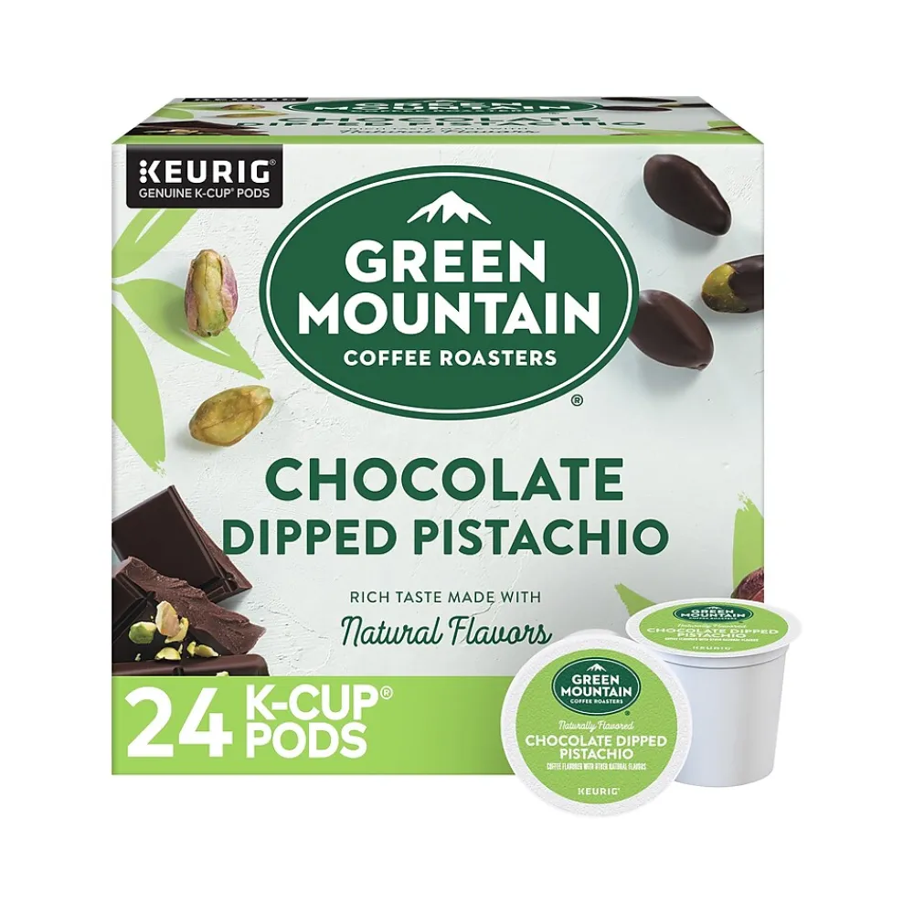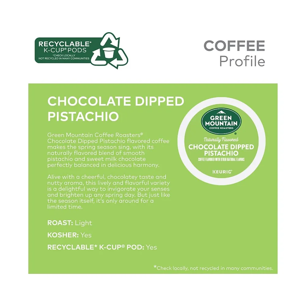 Discover a smooth and vibrant celebration of springtime delight in every sip. Green Mountain Coffee Roasters chocolate dipped pistachio flavored coffee makes the spring season sing, with its naturally flavored blend of smooth pistachio and sweet milk chocolate perfectly balanced in delicious harmony. Alive with a cheerful chocolatey taste and nutty aroma, this lively and flavorful variety is a delightful way to invigorate your senses and brighten up any spring day. But just like the season itself, it’s only around for a limited time. Every Green Mountain Coffee Roasters K-Cup pod is filled with freshly ground coffee beans and brews a deliciously great-tasting cup of coffee, every time. That’s because every cup of Green Mountain Coffee Roasters is packed with goodness, reflecting our commitment to 100% responsibly sourced coffee. These K-Cup pods are compatible with all Keurig single serve coffee makers. Simple. Delicious. And recyclable. Enjoy the same great-tasting coffee you know and love, and when you’re done, just peel, empty, and recycle.