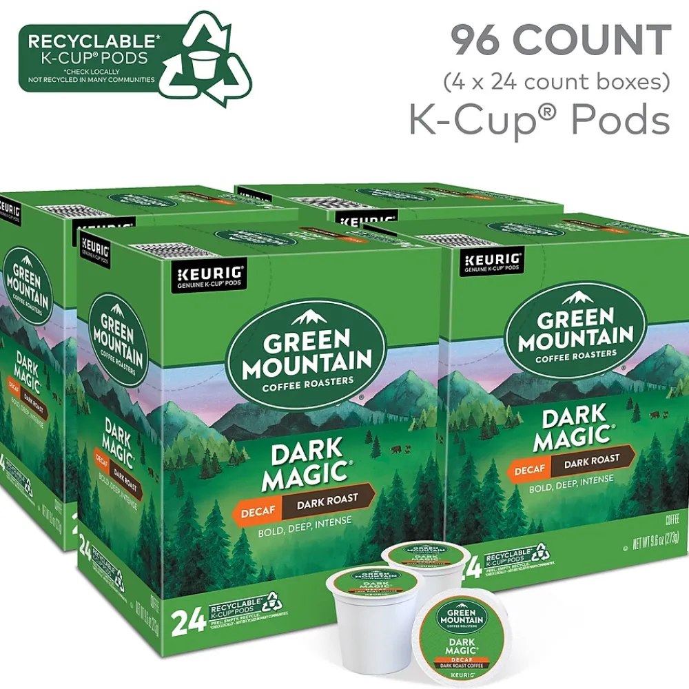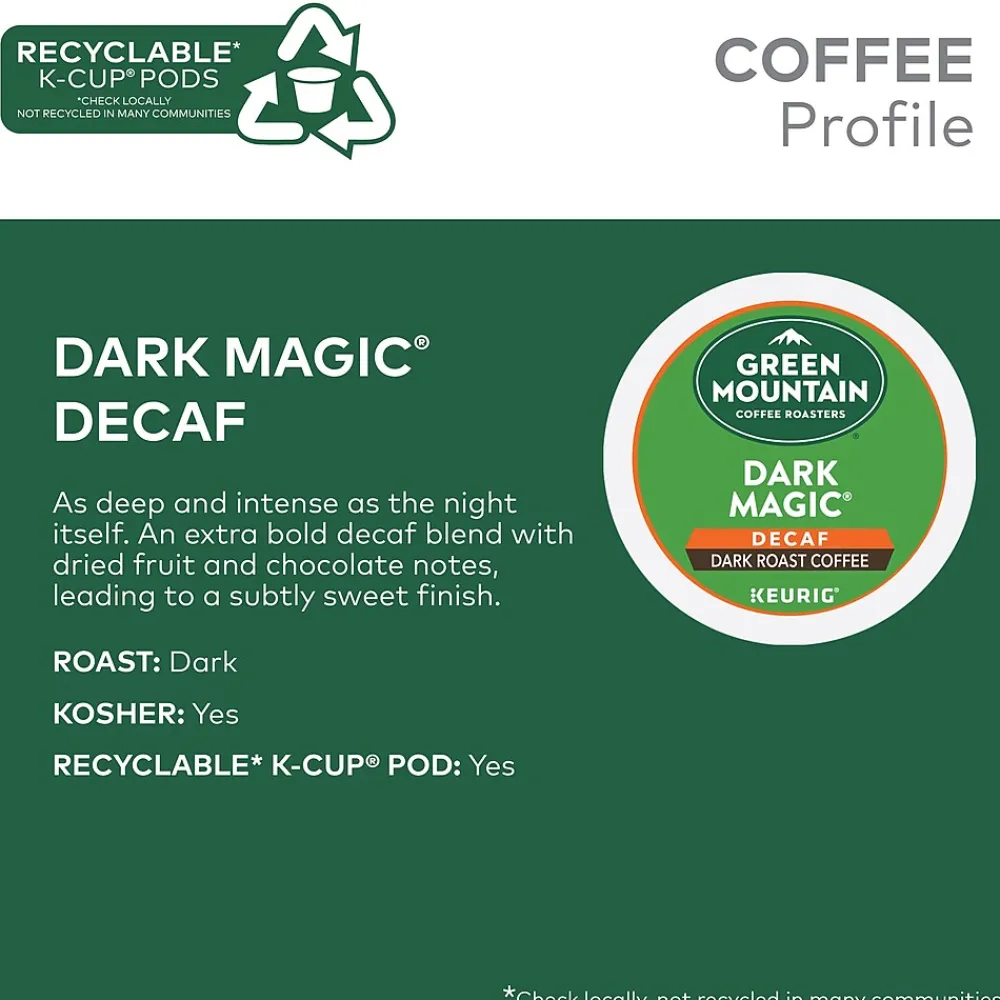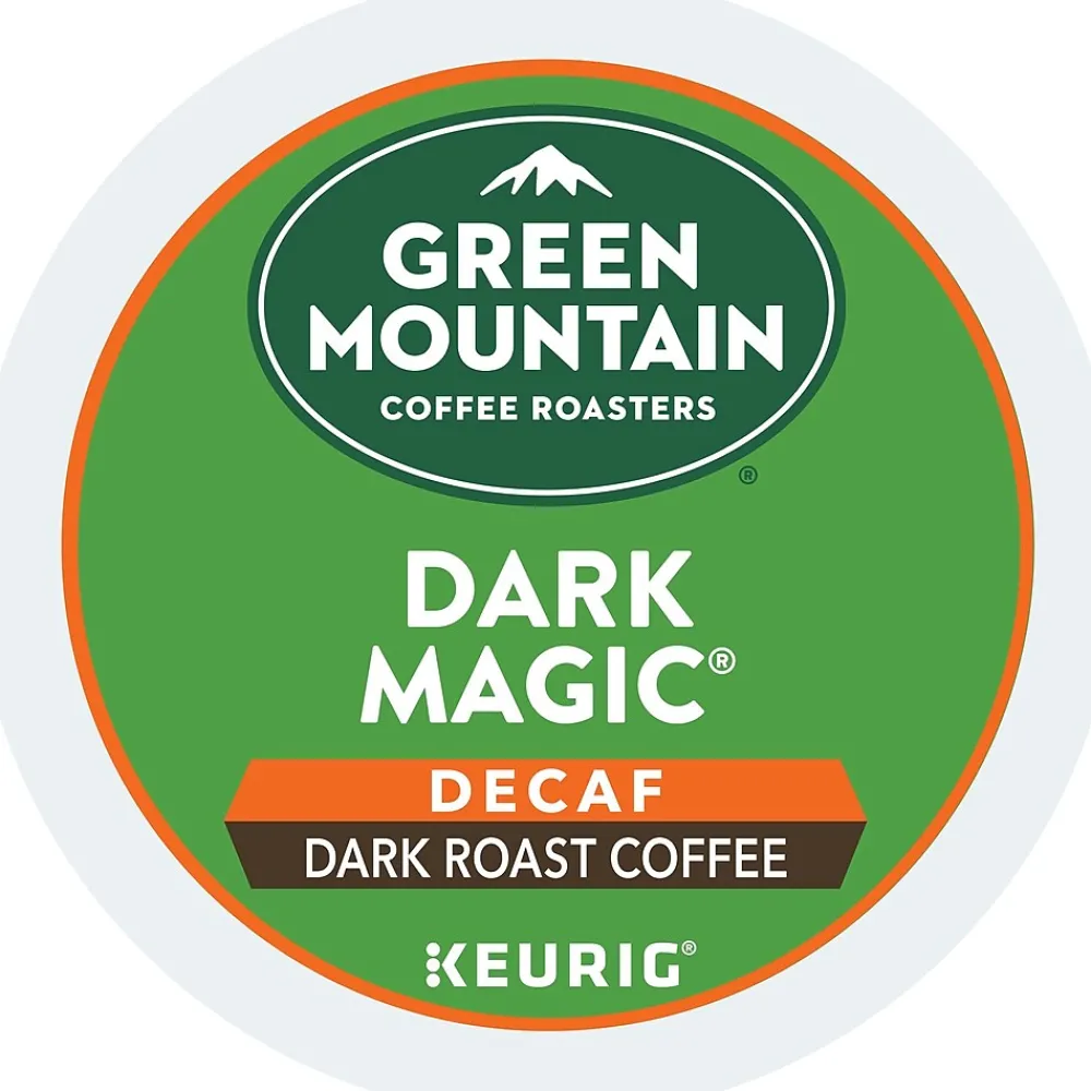 Skip the buzz but keep the taste with a cup from these decaf coffee pods. The Dark Magic flavor offers a rich, bold taste and smooth finish. These Keurig K-Cup Green Mountain Coffee Roasters Dark Magic decaf coffee pods make it easy to create a single serving, and with 96 in a pack, stocking up is simple.