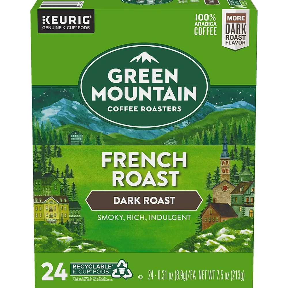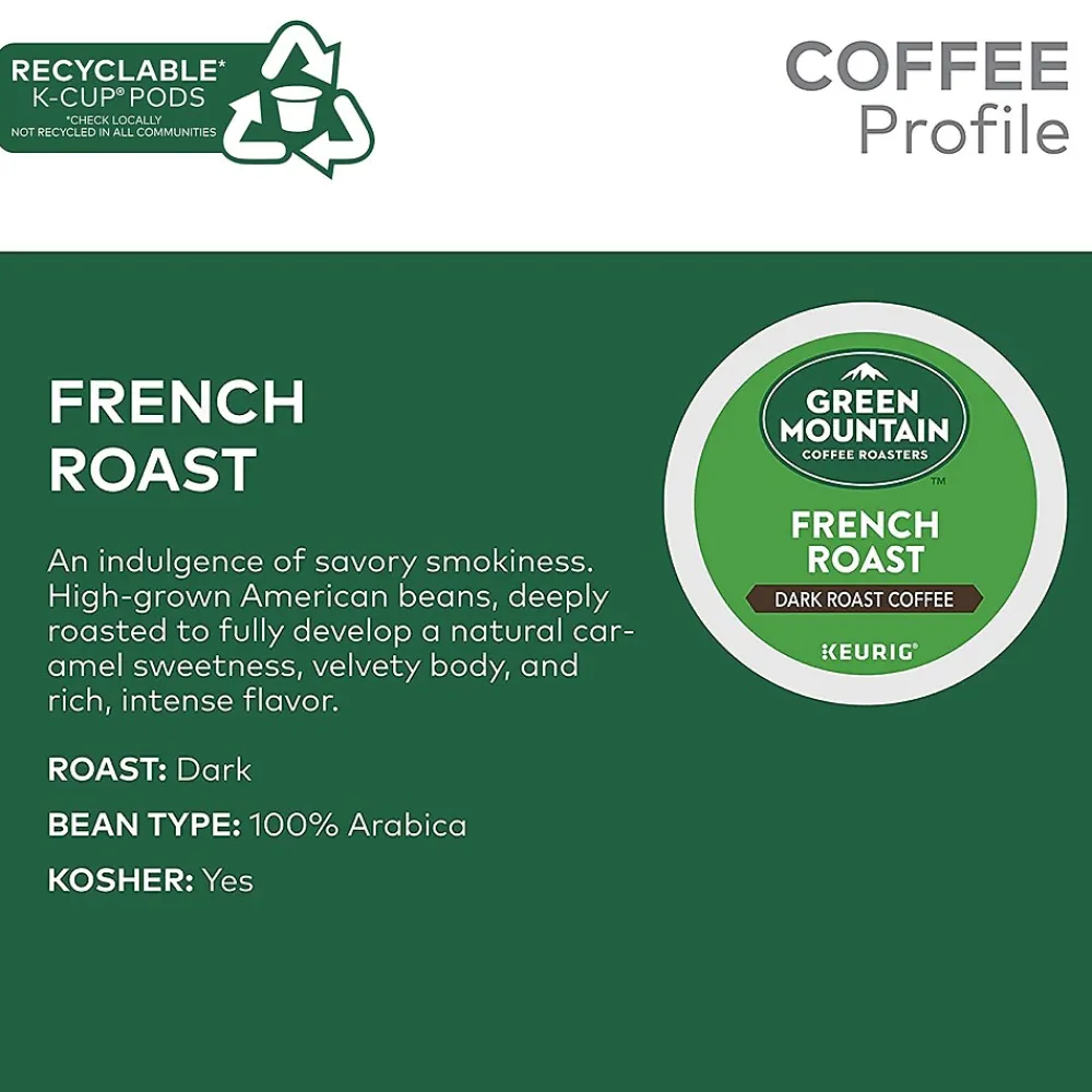 Stock the break room with this Keurig K-Cup Green Mountain Coffee Roasters French Roast coffee, which comes in a bulk pack of 24. The individual cups work with Keurig single-serving coffee makers, delivering perfectly brewed cups made to each user’s tastes. These self-contained Keurig K-Cup Green Mountain Coffee Roasters French Roast coffee deliver efficient brewing and quick, simple cleanup, keeping your break room tidier.