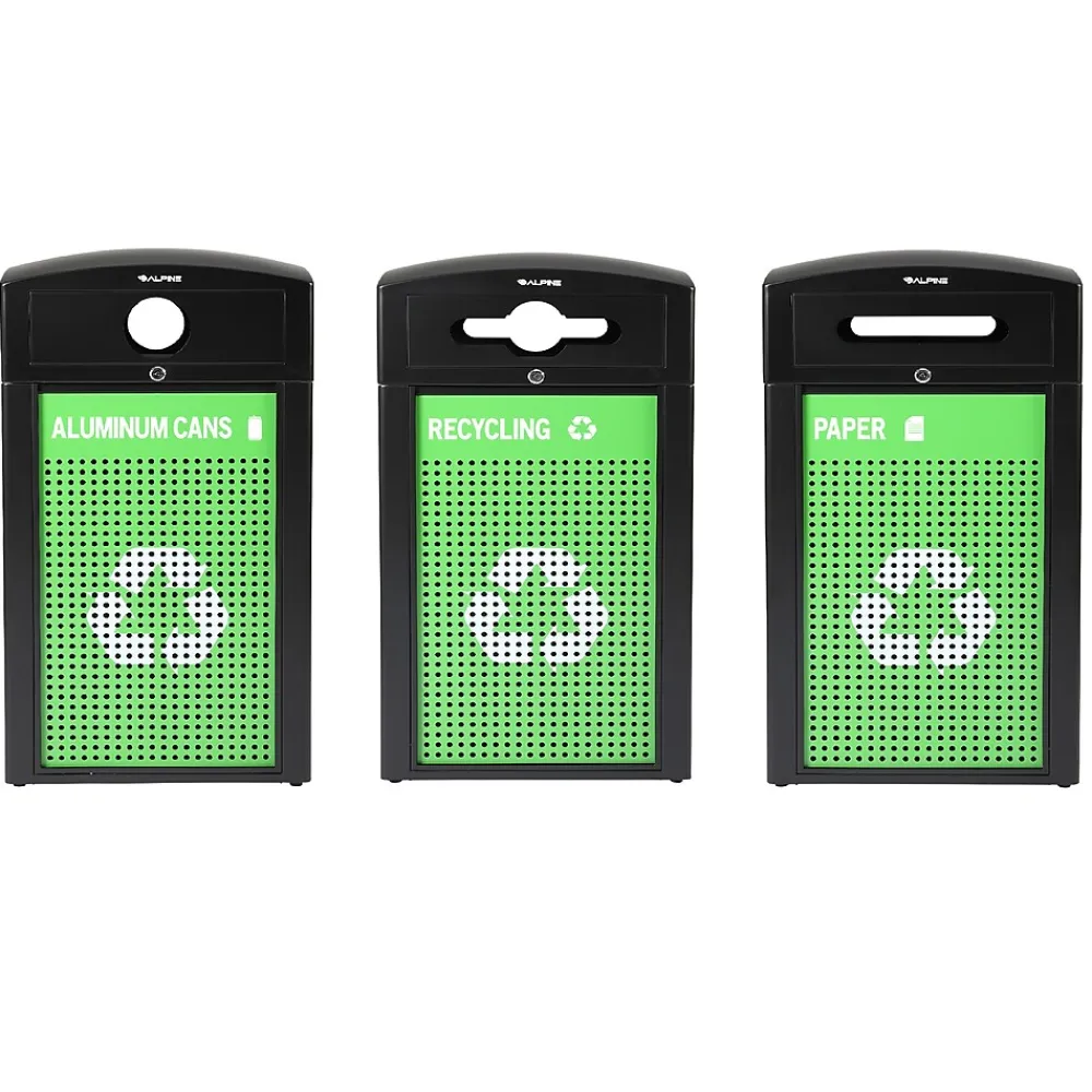 When equipping your business’s exterior with waste receptacles, you want to be reassured that it will last in the harshest weather conditions but is also aesthetically pleasing. With our 120-gallon all-weather recycling bin combo station, you can check off both qualities. Our receptacle features a prominent white recycling symbol on the panels, a large section to display the included stickers and a circular opening to dispose of aluminum cans, bottles, and a mixed slot and regular slot opening to separate out other recycling material properly. Its weather-resistant powder-coated steel frame and lid will ensure its longevity while maintaining its quality. Additionally, its solid dome lids allows rain to glide off quickly and not pool, decreasing the likelihood of corrosion. The included heavy-duty plastic interior bins will securely hold trash bags without worrying about leaks. Since your terrain isn’t always guaranteed to be perfectly flat, we have outfitted our trash container with adjustable legs. They will help certify stability and support on uneven surfaces. The Alpine recycle outdoor receptacle is vital to keeping your facilities clean and elevating your aesthetic. We understand that sometimes things happen, such as theft or vandalism; therefore, we’ve equipped each trash container with a lock and key to help protect your investment. Includes two chain-link security chains that prevent your lid from falling when opened.