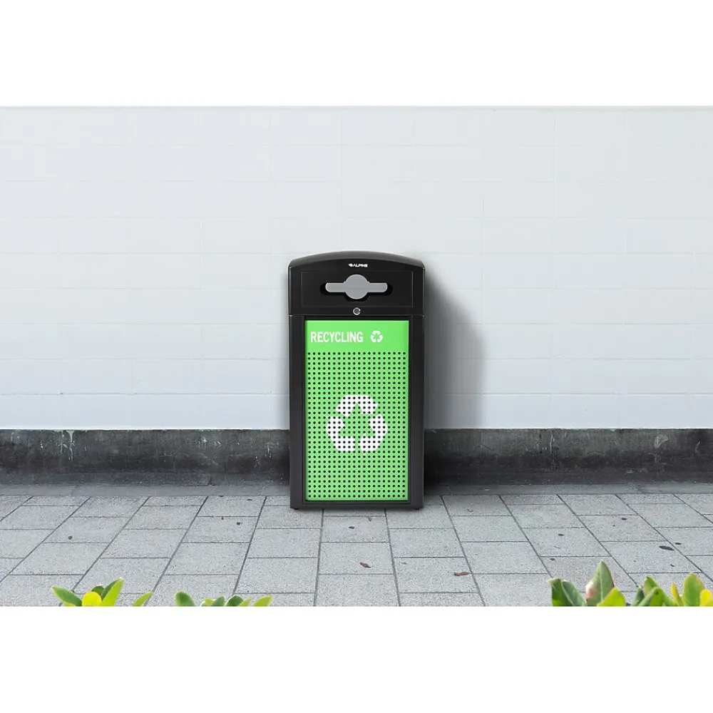 When equipping your business’s exterior with waste receptacles, you want to be reassured that it will last in the harshest weather conditions but is also aesthetically pleasing. With our 40-gallon all-weather recycling bin, you can check off both qualities. Our receptacle features a prominent white recycling symbol on the panels, a large section to display the included stickers and a mixed slot opening to dispose of all kinds of recycling material properly. Its weather-resistant powder-coated steel frame and lid will ensure its longevity while maintaining its quality. Additionally, its solid dome lids allows rain to glide off quickly and not pool, decreasing the likelihood of corrosion. The included heavy-duty plastic interior bins will securely hold trash bags without worrying about leaks. Since your terrain isn’t always guaranteed to be perfectly flat, we have outfitted our trash container with adjustable legs. They will help certify stability and support on uneven surfaces. The Alpine recycle outdoor receptacle is vital to keeping your facilities clean and elevating your aesthetic. We understand that sometimes things happen, such as theft or vandalism; therefore, we’ve equipped each trash container with a lock and key to help protect your investment. Includes two chain-link security chains that prevent your lid from falling when opened.