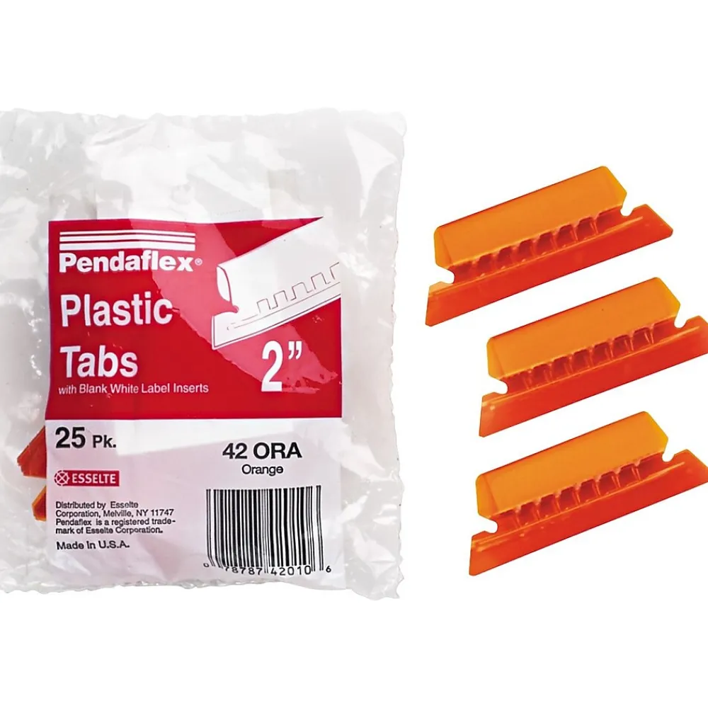 Pendaflex Hanging Folder Tabs allow you to customize your hanging folders. Clear orange plastic tabs (2″ wide) with blank white inserts. Stagger the position of your tabs from folder to folder to keep each file heading in view. Tabs are large and angled for easy viewing. For letter and legal-sized hanging folders. 25 Tabs and inserts per pack.