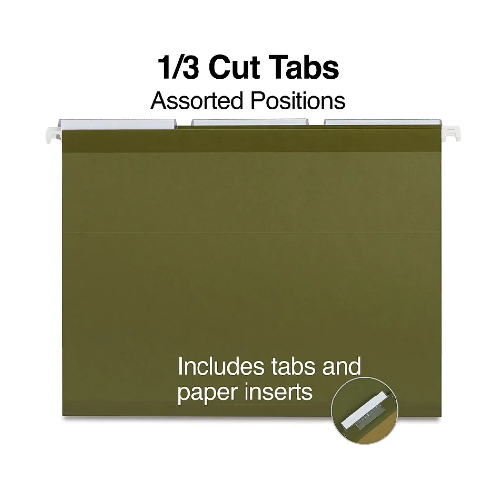 Retrieve documents quickly from these standard green hanging file folders. Three repositionable tabs offer quick reference and easy viewing, and durable paper stock provides strength to prevent tearing. The ample folders are sized perfectly to accommodate letter-size papers and files and feature coated hangers and reinforced tabs for frequent and lasting use. This box of Staples reinforced letter-size standard green hanging file folders includes 25 units to suit your organization and filing needs.