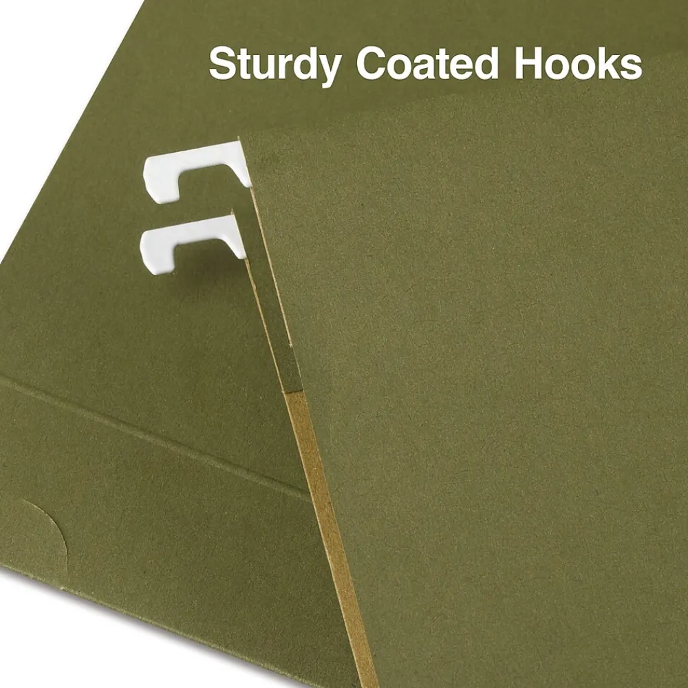 Organize manuals, brochures and bulky reference materials inside these legal-size hanging file folders. The box bottom expands up to 2 inches wide to accommodate thick files, and the standard legal size is ideal for official documents. This 25-count box of Staples box-bottom 2-inch legal-size hanging file folders features standard green paper stock to help minimize tearing and coated hangers to support easy access.
