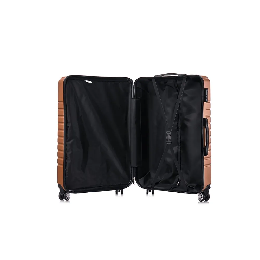 The Toscano Rigoroso 3-Piece Luggage Set in Bronze Gold (S0567-03PC-BRGL) offers a blend of luxury and durability, making it an ideal choice for travelers who appreciate sophisticated design. This set includes a carry-on, a medium-sized suitcase, and a large checked bag, all showcasing an elegant bronze-gold finish with a scratch-resistant hard shell for lasting protection and a touch of opulence.Constructed from lightweight yet resilient materials, the Rigoroso set ensures seamless travel with 360-degree spinner wheels and an ergonomic telescoping handle for effortless mobility. The interiors are spacious and thoughtfully designed, featuring adjustable straps and multiple compartments for organized packing. With a 2″ expandable feature, the set allows for up to 35% more packing capacity, perfect for accommodating extra items. It also includes a built-in combination lock for added security and soft jelly handle grips for comfortable handling.Combining bold design with practical functionality, the Toscano Rigoroso set in Bronze Gold is perfect for travelers who desire a refined, high-performance luggage set.