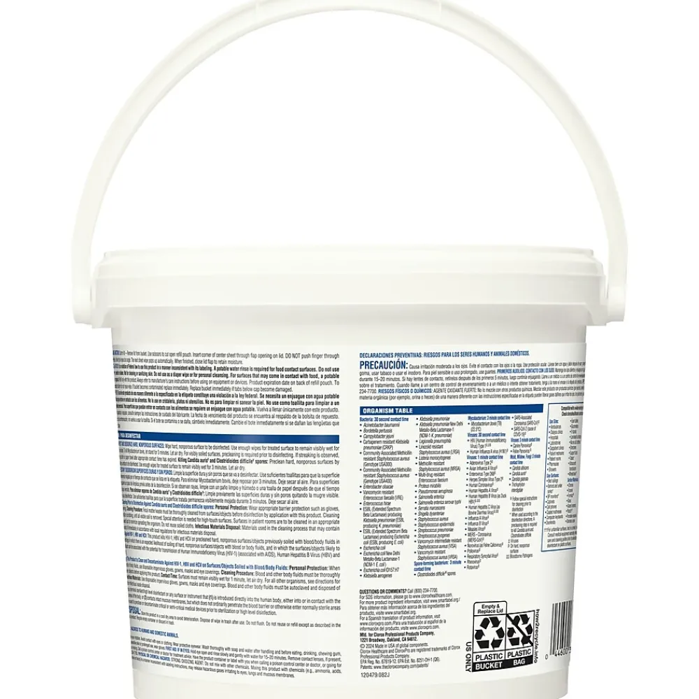 Your proven bleach solution for cleaning. Clorox Healthcare Bleach Germicidal Wipes kill C. difficile* and C. auris in 3 minutes and 58 other microorganisms in 1 minute or less, including outbreak causing viruses, emerging viral pathogens, MRSA and VRE**. With superior surface compatibility on a wide range of hospital surfaces, these disinfecting wipes help you cover more square footage per wipe with fast contact times and greater wetness surface coverage than the leading competitor. The phosphate free formula is optimized to be easy on surfaces and leaves less residue behind. Use this refillable bucket in healthcare settings including hospitals, medical facilities, outpatient facilities and long term care facilities. *Follow special instructions for cleaning prior to disinfection. **When used as directed. A precleaning step is required to kill Clostridioides difficile and Candida auris. ***Analysis of Clorox Healthcare customer sales data, April 2024.