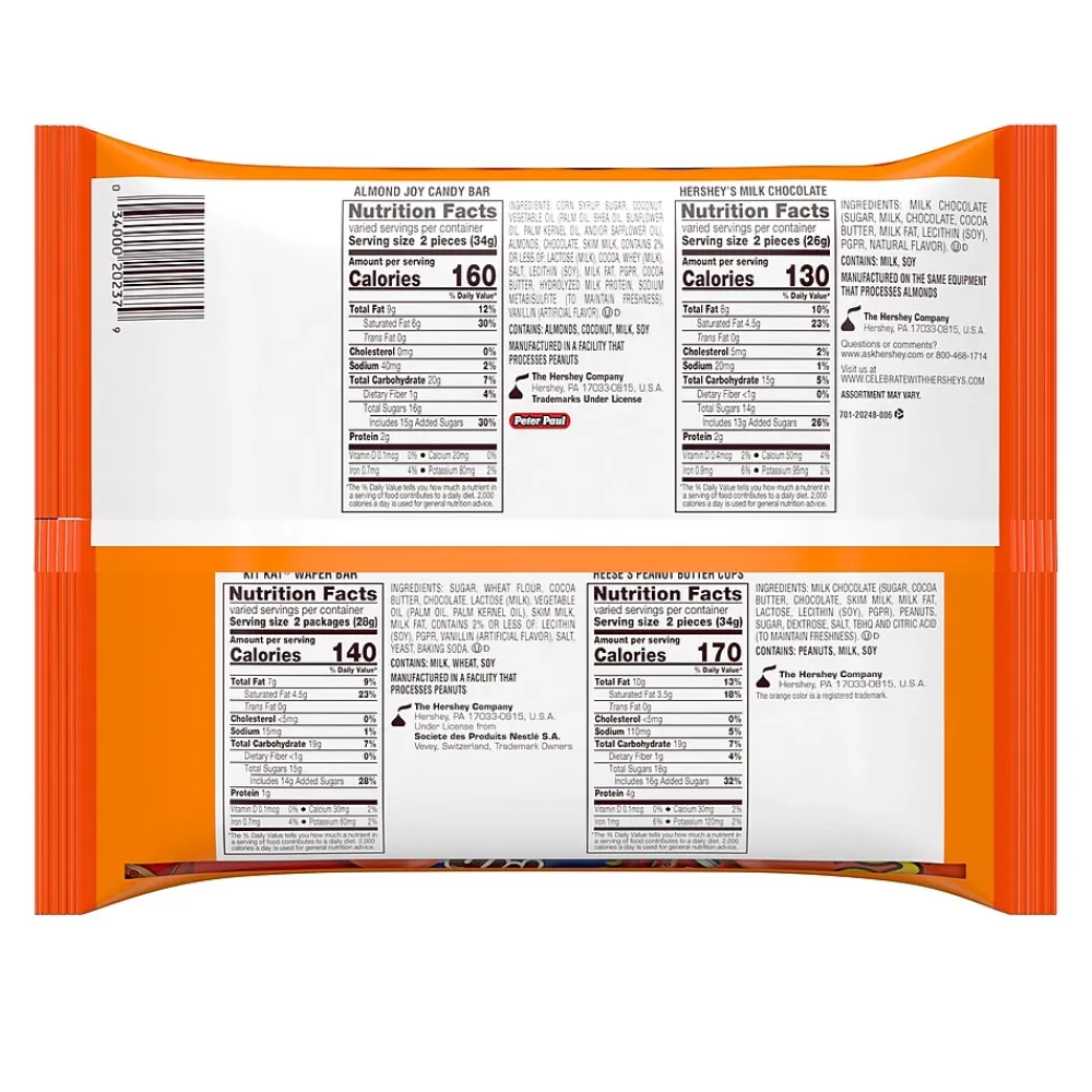 - Includes REESE’S milk chocolate peanut butter cups, HERSHEY’S milk chocolate bars, KIT KAT® milk chocolate wafer bars and ALMOND JOY coconut and almond chocolate bars