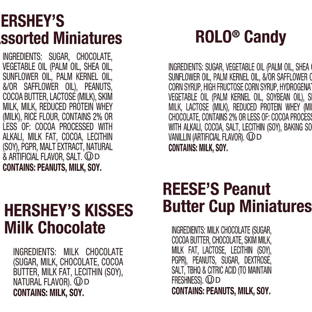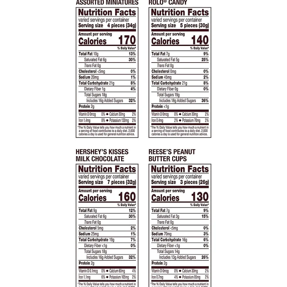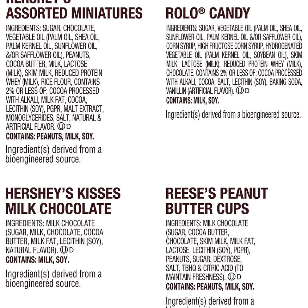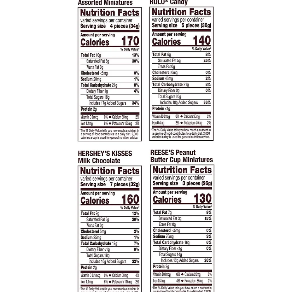 - Includes HERSHEY’S Miniatures assorted chocolate candy bars, REESE’S Miniatures milk chocolate peanut butter cups candy, HERSHEY’S KISSES milk chocolate candy and ROLO® rich chocolate caramel candy