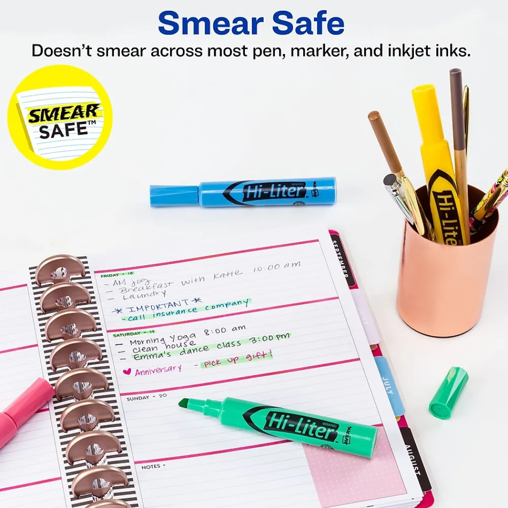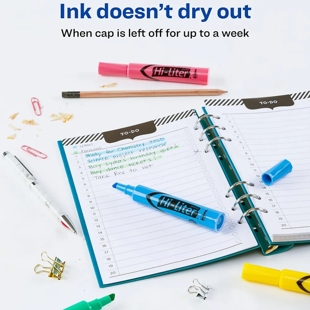 Call out bright ideas with this Hi-Liter set that lets you mark key words and phrases with brilliant, nontoxic colors. The molded chisel tip lets you highlight or underline, and the plastic tip won’t fray or mush. A faceted barrel provides a comfortable grip, so you can easily use the highlighter as you mark documents, notes, books and more. The improved formula means you can leave the cap off for up to a week and still highlight with ease. Trust the original.